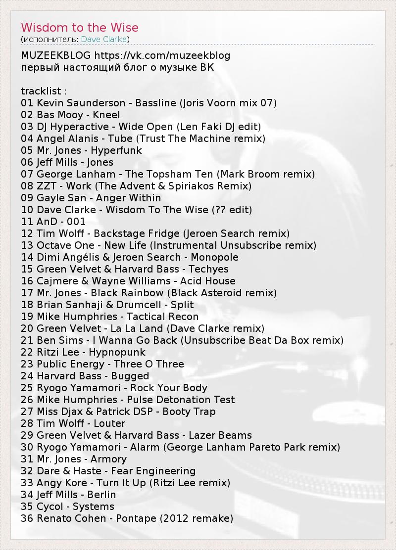 MUZEEKBLOG https://vk.com/muzeekblog первый настоящий блог о музыке ВК tracklist : 01 Kevin Saunderson - Bassline (Joris Voorn mix 07) 02 Bas Mooy - Kneel 03 DJ Hyperactive - Wide Open (Len Faki DJ edit) 04 Angel Alanis - Tube (Trust The Machine remix) 05 Mr. Jones - Hyperfunk 06 Jeff Mills - Jones 07 George Lanham - The Topsham Ten (Mark Broom remix) 08 ZZT - Work (The Advent & Spiriakos Remix) 09 Gayle San - Anger Within 10 Dave Clarke - Wisdom To The Wise (?? edit) 11 AnD - 001 12 Tim Wolff - Backstage Fridge (Jeroen Search remix) 13 Octave One - New Life (Instrumental Unsubscribe remix) 14 Dimi Angélis & Jeroen Search - Monopole 15 Green Velvet & Harvard Bass - Techyes 16 Cajmere & Wayne Williams - Acid House 17 Mr. Jones - Black Rainbow (Black Asteroid remix) 18 Brian Sanhaji & Drumcell - Split 19 Mike Humphries - Tactical Recon 20 Green Velvet - La La Land (Dave Clarke remix) 21 Ben Sims - I Wanna Go Back (Unsubscribe Beat Da Box remix) 22 Ritzi Lee - Hypnopunk 23 Public Energy - Three O Three 24 Harvard Bass - Bugged 25 Ryogo Yamamori - Rock Your Body 26 Mike Humphries - Pulse Detonation Test 27 Miss Djax & Patrick DSP - Booty Trap 28 Tim Wolff - Louter 29 Green Velvet & Harvard Bass - Lazer Beams 30 Ryogo Yamamori - Alarm (George Lanham Pareto Park remix) 31 Mr. Jones - Armory 32 Dare & Haste - Fear Engineering 33 Angy Kore - Turn It Up (Ritzi Lee remix) 34 Jeff Mills - Berlin 35 Cycol - Systems 36 Renato Cohen - Pontape (2012 remake)