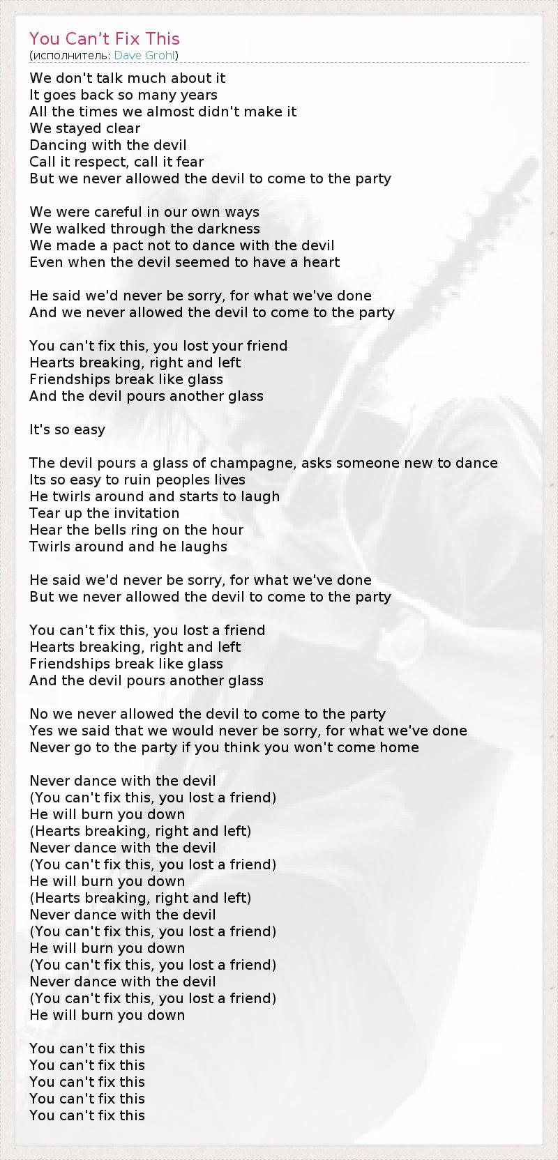 We don't talk much about it It goes back so many years All the times we almost didn't make it We stayed clear Dancing with the devil Call it respect, call it fear But we never allowed the devil to come to the party We were careful in our own ways We walked through the darkness We made a pact not to dance with the devil Even when the devil seemed to have a heart He said we'd never be sorry, for what we've done And we never allowed the devil to come to the party You can't fix this, you lost your friend Hearts breaking, right and left Friendships break like glass And the devil pours another glass It's so easy The devil pours a glass of champagne, asks someone new to dance Its so easy to ruin peoples lives He twirls around and starts to laugh Tear up the invitation Hear the bells ring on the hour Twirls around and he laughs He said we'd never be sorry, for what we've done But we never allowed the devil to come to the party You can't fix this, you lost a friend Hearts breaking, right and left Friendships break like glass And the devil pours another glass No we never allowed the devil to come to the party Yes we said that we would never be sorry, for what we've done Never go to the party if you think you won't come home Never dance with the devil (You can't fix this, you lost a friend) He will burn you down (Hearts breaking, right and left) Never dance with the devil (You can't fix this, you lost a friend) He will burn you down (Hearts breaking, right and left) Never dance with the devil (You can't fix this, you lost a friend) He will burn you down (You can't fix this, you lost a friend) Never dance with the devil (You can't fix this, you lost a friend) He will burn you down You can't fix this You can't fix this You can't fix this You can't fix this You can't fix this