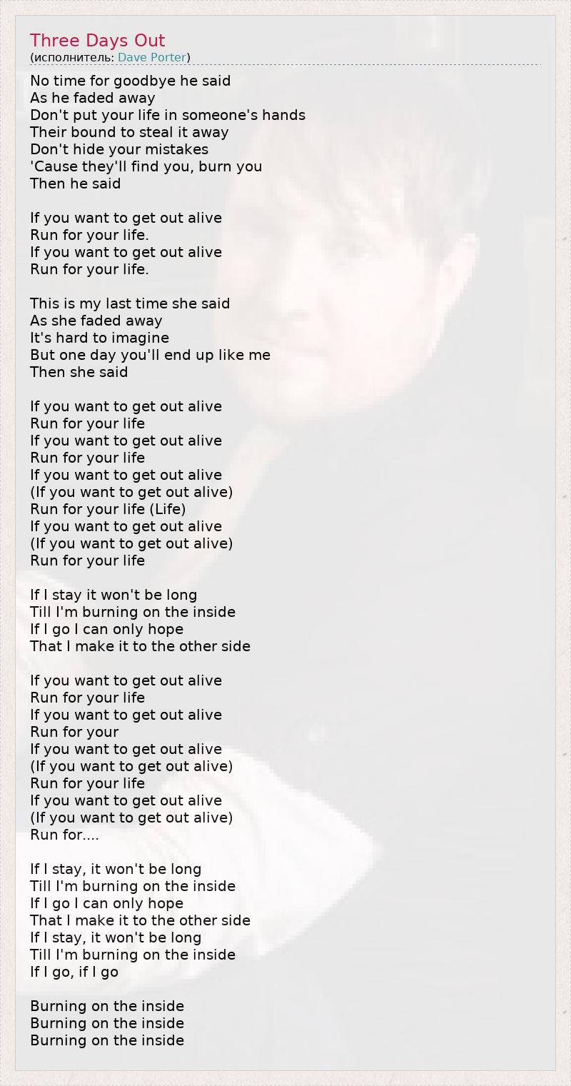 No time for goodbye he said As he faded away Don't put your life in someone's hands Their bound to steal it away Don't hide your mistakes 'Cause they'll find you, burn you Then he said If you want to get out alive Run for your life. If you want to get out alive Run for your life. This is my last time she said As she faded away It's hard to imagine But one day you'll end up like me Then she said If you want to get out alive Run for your life If you want to get out alive Run for your life If you want to get out alive (If you want to get out alive) Run for your life (Life) If you want to get out alive (If you want to get out alive) Run for your life If I stay it won't be long Till I'm burning on the inside If I go I can only hope That I make it to the other side If you want to get out alive Run for your life If you want to get out alive Run for your If you want to get out alive (If you want to get out alive) Run for your life If you want to get out alive (If you want to get out alive) Run for.... If I stay, it won't be long Till I'm burning on the inside If I go I can only hope That I make it to the other side If I stay, it won't be long Till I'm burning on the inside If I go, if I go Burning on the inside Burning on the inside Burning on the inside