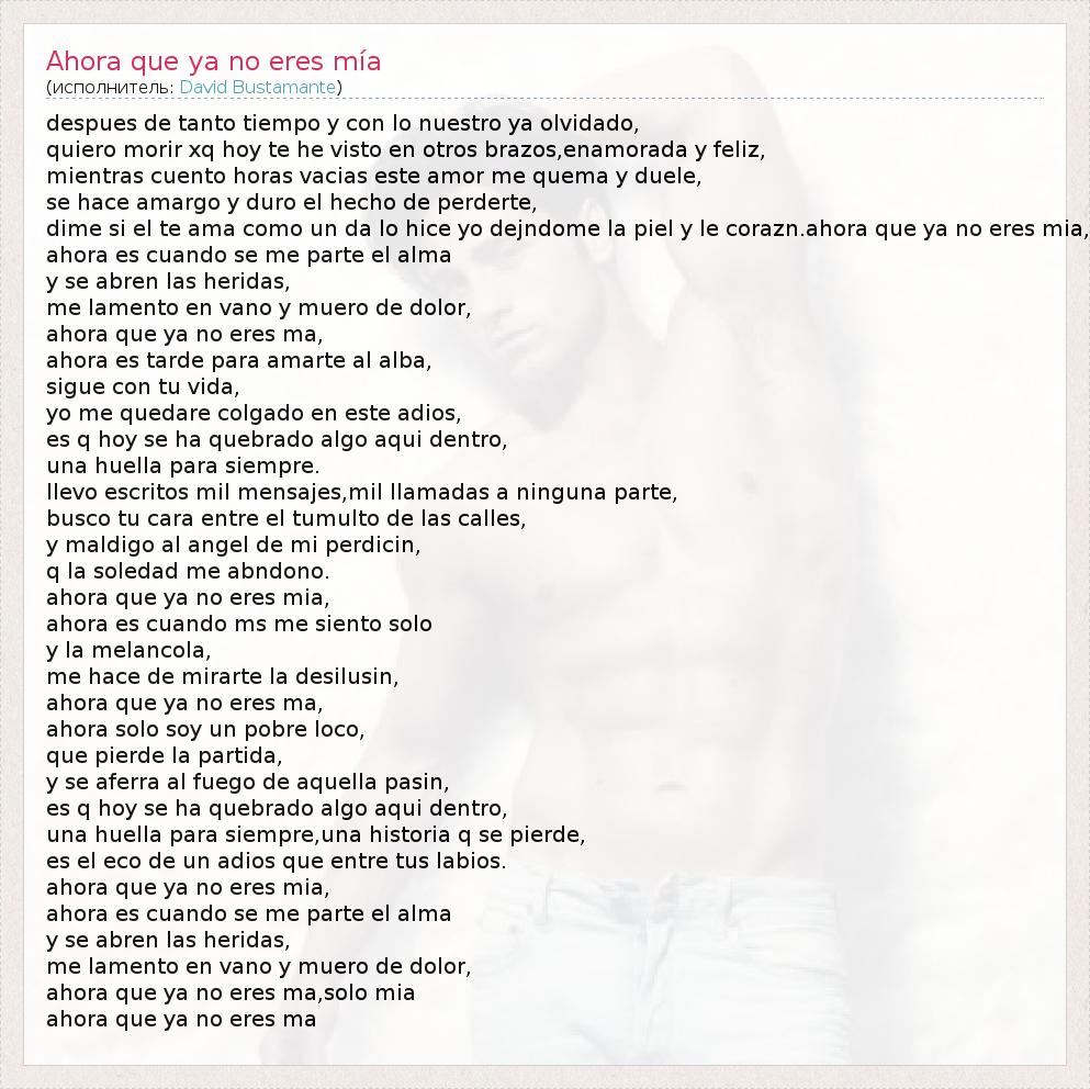 despues de tanto tiempo y con lo nuestro ya olvidado, quiero morir xq hoy te he visto en otros brazos,enamorada y feliz, mientras cuento horas vacias este amor me quema y duele, se hace amargo y duro el hecho de perderte, dime si el te ama como un da lo hice yo dejndome la piel y le corazn.ahora que ya no eres mia, ahora es cuando se me parte el alma y se abren las heridas, me lamento en vano y muero de dolor, ahora que ya no eres ma, ahora es tarde para amarte al alba, sigue con tu vida, yo me quedare colgado en este adios, es q hoy se ha quebrado algo aqui dentro, una huella para siempre. llevo escritos mil mensajes,mil llamadas a ninguna parte, busco tu cara entre el tumulto de las calles, y maldigo al angel de mi perdicin, q la soledad me abndono. ahora que ya no eres mia, ahora es cuando ms me siento solo y la melancola, me hace de mirarte la desilusin, ahora que ya no eres ma, ahora solo soy un pobre loco, que pierde la partida, y se aferra al fuego de aquella pasin, es q hoy se ha quebrado algo aqui dentro, una huella para siempre,una historia q se pierde, es el eco de un adios que entre tus labios. ahora que ya no eres mia, ahora es cuando se me parte el alma y se abren las heridas, me lamento en vano y muero de dolor, ahora que ya no eres ma,solo mia ahora que ya no eres ma