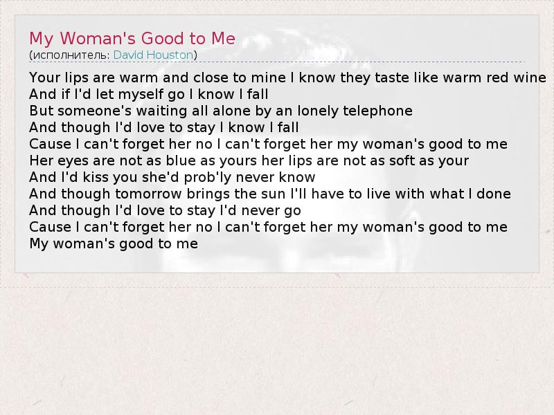 Your lips are warm and close to mine I know they taste like warm red wine And if I'd let myself go I know I fall But someone's waiting all alone by an lonely telephone And though I'd love to stay I know I fall Cause I can't forget her no I can't forget her my woman's good to me Her eyes are not as blue as yours her lips are not as soft as your And I'd kiss you she'd prob'ly never know And though tomorrow brings the sun I'll have to live with what I done And though I'd love to stay I'd never go Cause I can't forget her no I can't forget her my woman's good to me My woman's good to me