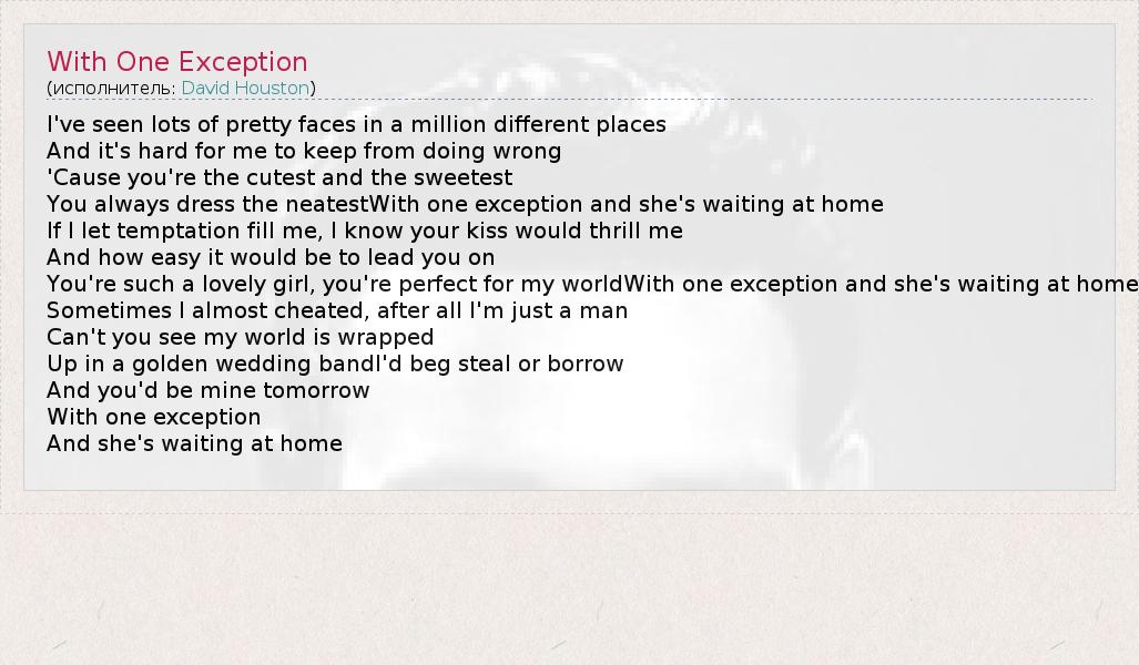 I've seen lots of pretty faces in a million different places And it's hard for me to keep from doing wrong 'Cause you're the cutest and the sweetest You always dress the neatestWith one exception and she's waiting at home If I let temptation fill me, I know your kiss would thrill me And how easy it would be to lead you on You're such a lovely girl, you're perfect for my worldWith one exception and she's waiting at home Sometimes I almost cheated, after all I'm just a man Can't you see my world is wrapped Up in a golden wedding bandI'd beg steal or borrow And you'd be mine tomorrow With one exception And she's waiting at home