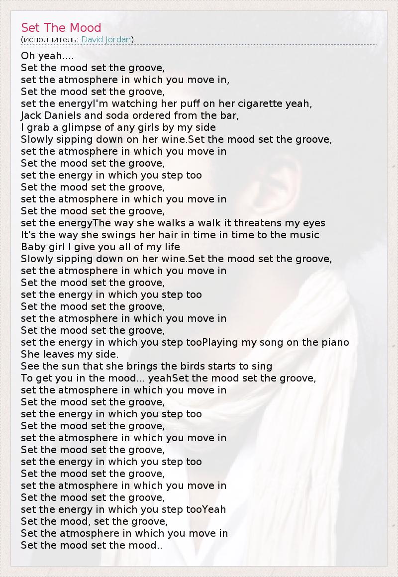 Oh yeah.... Set the mood set the groove, set the atmosphere in which you move in, Set the mood set the groove, set the energyI'm watching her puff on her cigarette yeah, Jack Daniels and soda ordered from the bar, I grab a glimpse of any girls by my side Slowly sipping down on her wine.Set the mood set the groove, set the atmosphere in which you move in Set the mood set the groove, set the energy in which you step too Set the mood set the groove, set the atmosphere in which you move in Set the mood set the groove, set the energyThe way she walks a walk it threatens my eyes It's the way she swings her hair in time in time to the music Baby girl I give you all of my life Slowly sipping down on her wine.Set the mood set the groove, set the atmosphere in which you move in Set the mood set the groove, set the energy in which you step too Set the mood set the groove, set the atmosphere in which you move in Set the mood set the groove, set the energy in which you step tooPlaying my song on the piano She leaves my side. See the sun that she brings the birds starts to sing To get you in the mood... yeahSet the mood set the groove, set the atmosphere in which you move in Set the mood set the groove, set the energy in which you step too Set the mood set the groove, set the atmosphere in which you move in Set the mood set the groove, set the energy in which you step too Set the mood set the groove, set the atmosphere in which you move in Set the mood set the groove, set the energy in which you step tooYeah Set the mood, set the groove, Set the atmosphere in which you move in Set the mood set the mood..