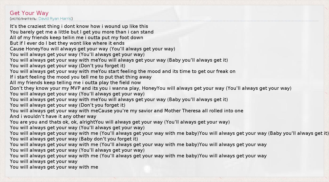 It's the craziest thing i dont know how i wound up like this You barely get me a little but I get you more than i can stand All of my friends keep tellin me i outta put my foot down But if I ever do I bet they wont like where it ends Cause HoneyYou will always get your way (You'll always get your way) You will always get your way (You'll always get your way) You will always get your way with meYou will always get your way (Baby you'll always get it) You will always get your way (Don't you forget it) You will always get your way with meYou start feeling the mood and its time to get our freak on If i start feeling the mood you tell me to put that thing away All my friends keep telling me i outta play the field now Don't they know your my MVP and its you i wanna play, HoneyYou will always get your way (You'll always get your way) You will always get your way (You'll always get your way) You will always get your way with meYou will always get your way (Baby you'll always get it) You will always get your way (Don't you forget it) You will always get your way with meCause you're my savior and Mother Theresa all rolled into one And i wouldn't have it any other way You are you and thats ok, ok, alrightYou will always get your way (You'll always get your way) You will always get your way (You'll always get your way) You will always get your way with me (You'll always get your way with me baby)You will always get your way (Baby you'll always get it) You will always get your way (Baby don't you forget it) You will always get your way with me (You'll always get your way with me baby)You will always get your way You will always get your way (You'll always get your way) You will always get your way with me (You'll always get your way with me baby)You will always get your way You will always get your way You will always get your way with me