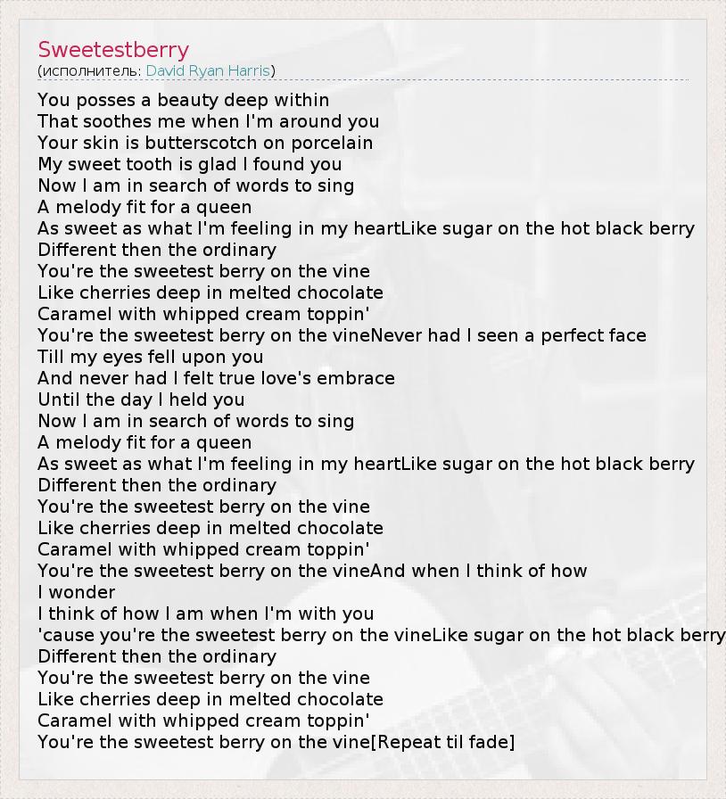 You posses a beauty deep within That soothes me when I'm around you Your skin is butterscotch on porcelain My sweet tooth is glad I found you Now I am in search of words to sing A melody fit for a queen As sweet as what I'm feeling in my heartLike sugar on the hot black berry Different then the ordinary You're the sweetest berry on the vine Like cherries deep in melted chocolate Caramel with whipped cream toppin' You're the sweetest berry on the vineNever had I seen a perfect face Till my eyes fell upon you And never had I felt true love's embrace Until the day I held you Now I am in search of words to sing A melody fit for a queen As sweet as what I'm feeling in my heartLike sugar on the hot black berry Different then the ordinary You're the sweetest berry on the vine Like cherries deep in melted chocolate Caramel with whipped cream toppin' You're the sweetest berry on the vineAnd when I think of how I wonder I think of how I am when I'm with you 'cause you're the sweetest berry on the vineLike sugar on the hot black berry Different then the ordinary You're the sweetest berry on the vine Like cherries deep in melted chocolate Caramel with whipped cream toppin' You're the sweetest berry on the vine[Repeat til fade]
