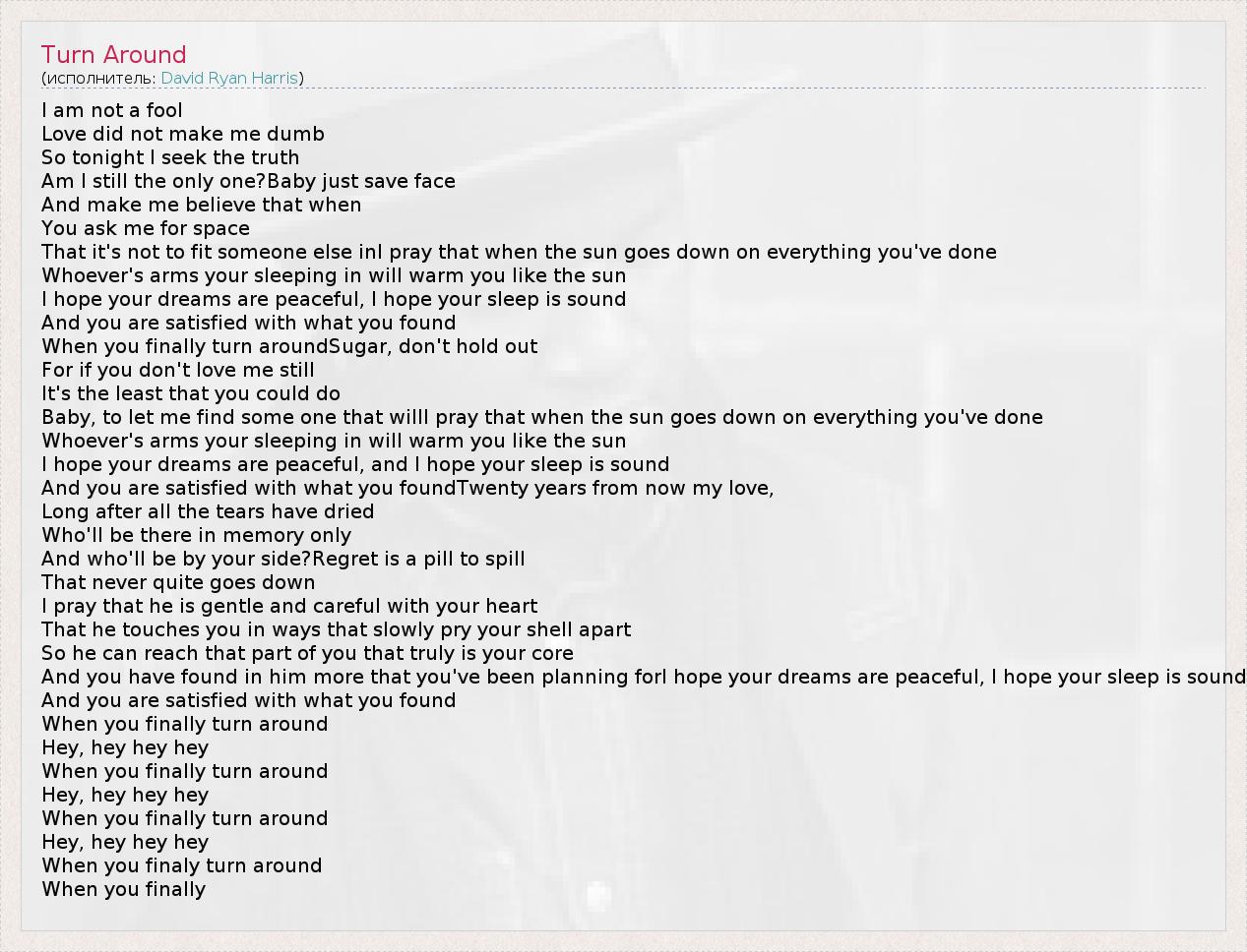 I am not a fool Love did not make me dumb So tonight I seek the truth Am I still the only one?Baby just save face And make me believe that when You ask me for space That it's not to fit someone else inI pray that when the sun goes down on everything you've done Whoever's arms your sleeping in will warm you like the sun I hope your dreams are peaceful, I hope your sleep is sound And you are satisfied with what you found When you finally turn aroundSugar, don't hold out For if you don't love me still It's the least that you could do Baby, to let me find some one that willI pray that when the sun goes down on everything you've done Whoever's arms your sleeping in will warm you like the sun I hope your dreams are peaceful, and I hope your sleep is sound And you are satisfied with what you foundTwenty years from now my love, Long after all the tears have dried Who'll be there in memory only And who'll be by your side?Regret is a pill to spill That never quite goes down I pray that he is gentle and careful with your heart That he touches you in ways that slowly pry your shell apart So he can reach that part of you that truly is your core And you have found in him more that you've been planning forI hope your dreams are peaceful, I hope your sleep is sound And you are satisfied with what you found When you finally turn around Hey, hey hey hey When you finally turn around Hey, hey hey hey When you finally turn around Hey, hey hey hey When you finaly turn around When you finally