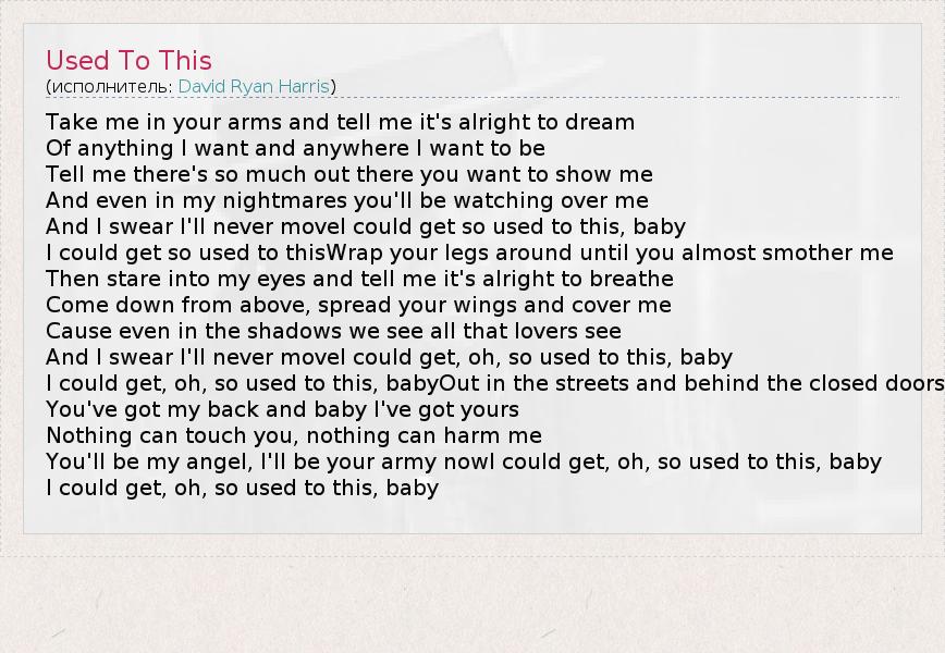 Take me in your arms and tell me it's alright to dream Of anything I want and anywhere I want to be Tell me there's so much out there you want to show me And even in my nightmares you'll be watching over me And I swear I'll never moveI could get so used to this, baby I could get so used to thisWrap your legs around until you almost smother me Then stare into my eyes and tell me it's alright to breathe Come down from above, spread your wings and cover me Cause even in the shadows we see all that lovers see And I swear I'll never moveI could get, oh, so used to this, baby I could get, oh, so used to this, babyOut in the streets and behind the closed doors You've got my back and baby I've got yours Nothing can touch you, nothing can harm me You'll be my angel, I'll be your army nowI could get, oh, so used to this, baby I could get, oh, so used to this, baby