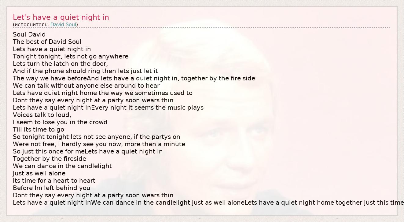 Soul David The best of David Soul Lets have a quiet night in Tonight tonight, lets not go anywhere Lets turn the latch on the door, And if the phone should ring then lets just let it The way we have beforeAnd lets have a quiet night in, together by the fire side We can talk without anyone else around to hear Lets have quiet night home the way we sometimes used to Dont they say every night at a party soon wears thin Lets have a quiet night inEvery night it seems the music plays Voices talk to loud, I seem to lose you in the crowd Till its time to go So tonight tonight lets not see anyone, if the partys on Were not free, I hardly see you now, more than a minute So just this once for meLets have a quiet night in Together by the fireside We can dance in the candlelight Just as well alone Its time for a heart to heart Before Im left behind you Dont they say every night at a party soon wears thin Lets have a quiet night inWe can dance in the candlelight just as well aloneLets have a quiet night home together just this time