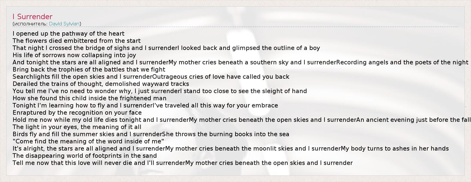 And tonight the stars are all aligned and I surrenderMy mother cries beneath a southern sky and I surrenderRecording angels and the poets of the night