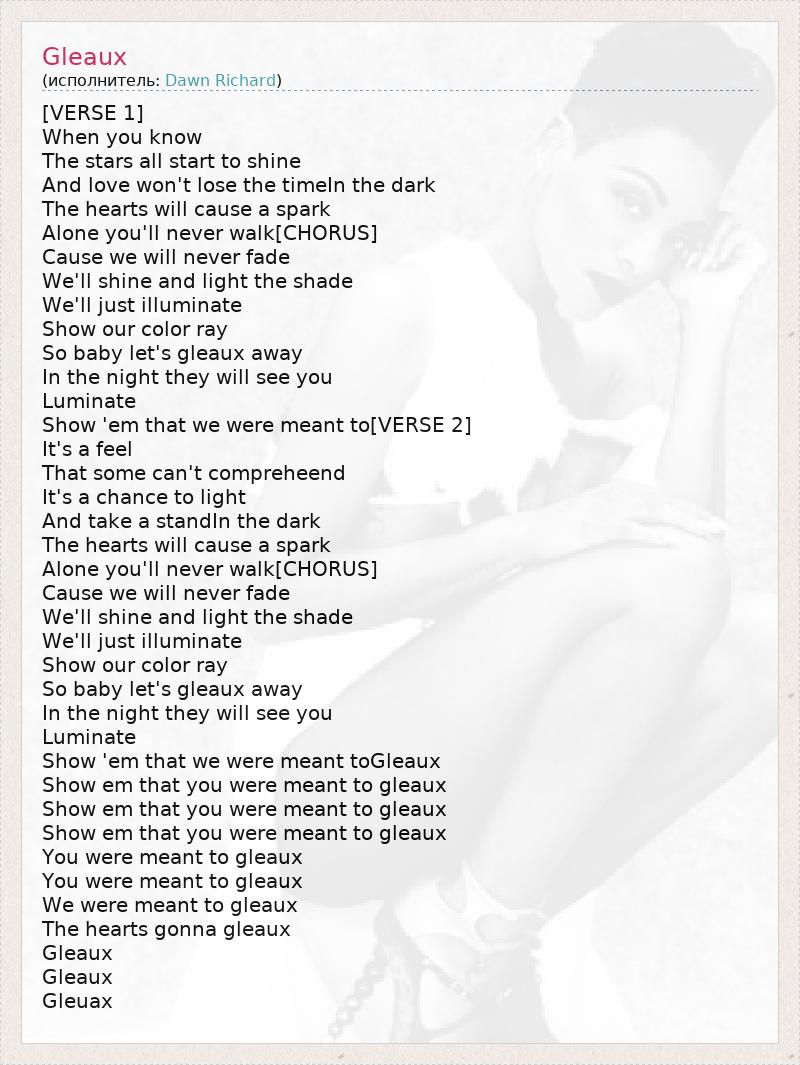 [VERSE 1] When you know The stars all start to shine And love won't lose the timeIn the dark The hearts will cause a spark Alone you'll never walk[CHORUS] Cause we will never fade We'll shine and light the shade We'll just illuminate Show our color ray So baby let's gleaux away In the night they will see you Luminate Show 'em that we were meant to[VERSE 2] It's a feel That some can't compreheend It's a chance to light And take a standIn the dark The hearts will cause a spark Alone you'll never walk[CHORUS] Cause we will never fade We'll shine and light the shade We'll just illuminate Show our color ray So baby let's gleaux away In the night they will see you Luminate Show 'em that we were meant toGleaux Show em that you were meant to gleaux Show em that you were meant to gleaux Show em that you were meant to gleaux You were meant to gleaux You were meant to gleaux We were meant to gleaux The hearts gonna gleaux Gleaux Gleaux Gleuax