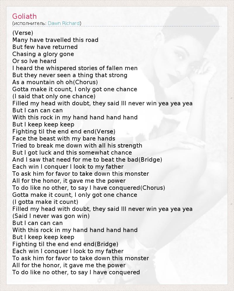 (Verse) Many have travelled this road But few have returned Chasing a glory gone Or so Ive heard I heard the whispered stories of fallen men But they never seen a thing that strong As a mountain oh oh(Chorus) Gotta make it count, I only got one chance (I said that only one chance) Filled my head with doubt, they said Ill never win yea yea yea But I can can can With this rock in my hand hand hand hand But I keep keep keep Fighting til the end end end(Verse) Face the beast with my bare hands Tried to break me down with all his strength But I got luck and this somewhat chance And I saw that need for me to beat the bad(Bridge) Each win I conquer I look to my father To ask him for favor to take down this monster All for the honor, it gave me the power To do like no other, to say I have conquered(Chorus) Gotta make it count, I only got one chance (I gotta make it count) Filled my head with doubt, they said Ill never win yea yea yea (Said I never was gon win) But I can can can With this rock in my hand hand hand hand But I keep keep keep Fighting til the end end end(Bridge) Each win I conquer I look to my father To ask him for favor to take down this monster All for the honor, it gave me the power To do like no other, to say I have conquered
