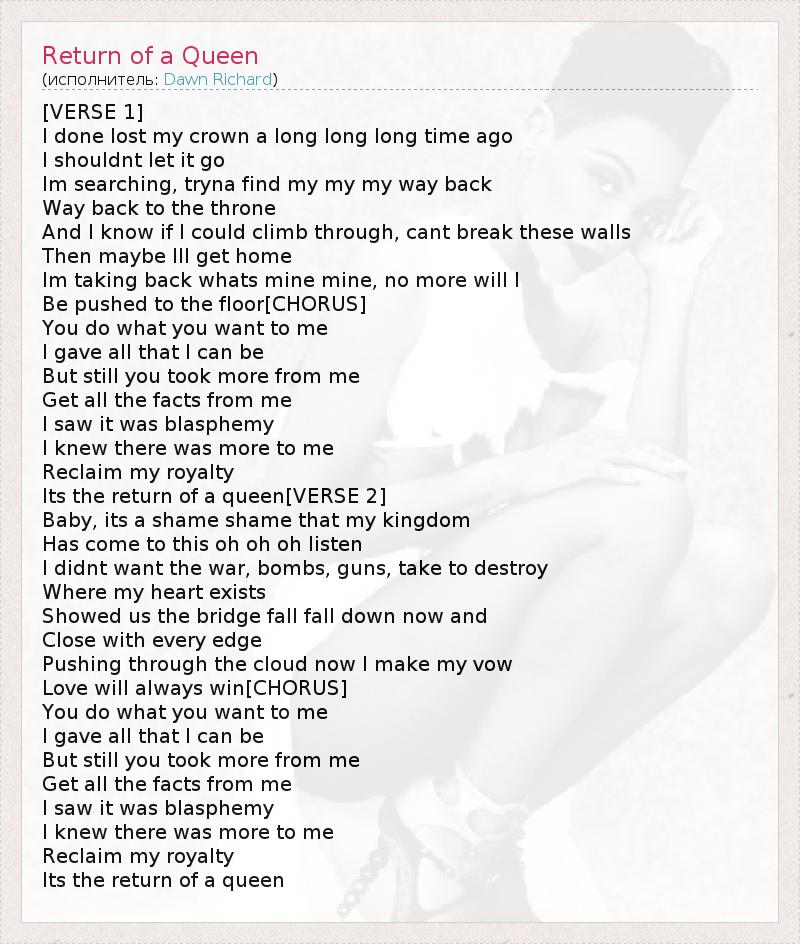 А как ты думаешь, о чем песня "Return of a Queen" ?