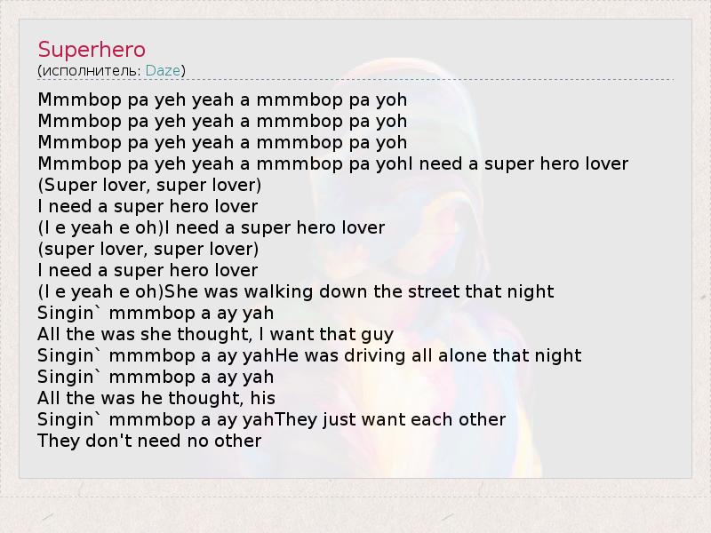 Mmmbop pa yeh yeah a mmmbop pa yoh Mmmbop pa yeh yeah a mmmbop pa yoh Mmmbop pa yeh yeah a mmmbop pa yoh Mmmbop pa yeh yeah a mmmbop pa yohI need a super hero lover (Super lover, super lover) I need a super hero lover (I e yeah e oh)I need a super hero lover (super lover, super lover) I need a super hero lover (I e yeah e oh)She was walking down the street that night Singin` mmmbop a ay yah All the was she thought, I want that guy Singin` mmmbop a ay yahHe was driving all alone that night Singin` mmmbop a ay yah All the was he thought, his Singin` mmmbop a ay yahThey just want each other They don't need no other