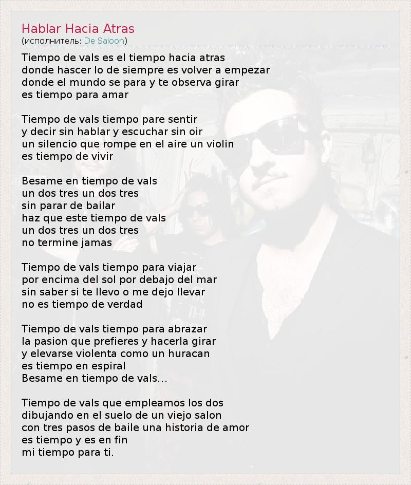 Tiempo de vals es el tiempo hacia atras donde hascer lo de siempre es volver a empezar donde el mundo se para y te observa girar es tiempo para amar Tiempo de vals tiempo pare sentir y decir sin hablar y escuchar sin oir un silencio que rompe en el aire un violin es tiempo de vivir Besame en tiempo de vals un dos tres un dos tres sin parar de bailar haz que este tiempo de vals un dos tres un dos tres no termine jamas Tiempo de vals tiempo para viajar por encima del sol por debajo del mar sin saber si te llevo o me dejo llevar no es tiempo de verdad Tiempo de vals tiempo para abrazar la pasion que prefieres y hacerla girar y elevarse violenta como un huracan es tiempo en espiral Besame en tiempo de vals… Tiempo de vals que empleamos los dos dibujando en el suelo de un viejo salon con tres pasos de baile una historia de amor es tiempo y es en fin mi tiempo para ti.