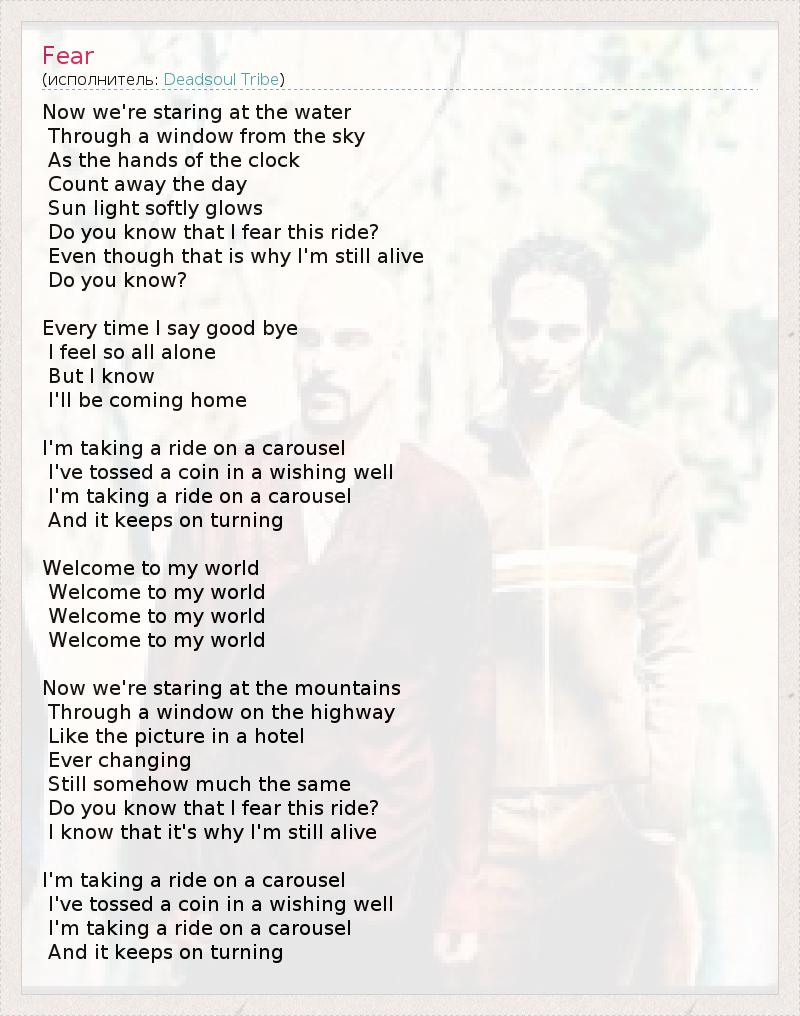 Теперь мы смотрим на воду, Через окна в небесах. Пока часы на стрелках Уносят время прочь. Солнце мягко светит, Ты знаешь, что я боюсь это поездки? И даже хотя из-за этого я еще жив, Ты знаешь? Каждый раз, когда я говорю прощай, Я чувствую себя столь одиноким, Но я знаю, Что вернусь домой. Я решил проехаться на карусели, Я опустил монетку в стену желаний. Я еду на карусели, А она все кружиться. Добро пожаловать в мой мир Теперь мы смотрим на горы, Из машин на автостраде, Как картинка в отеле, Вечно меняется, Оставаясь прежней. Ты знаешь, что я боюсь это поездки? Пусть даже из-за нее, я еще жив. Я решил проехаться на карусели, Я опустил монетку в стену желаний. Я еду на карусели, А она все кружиться.