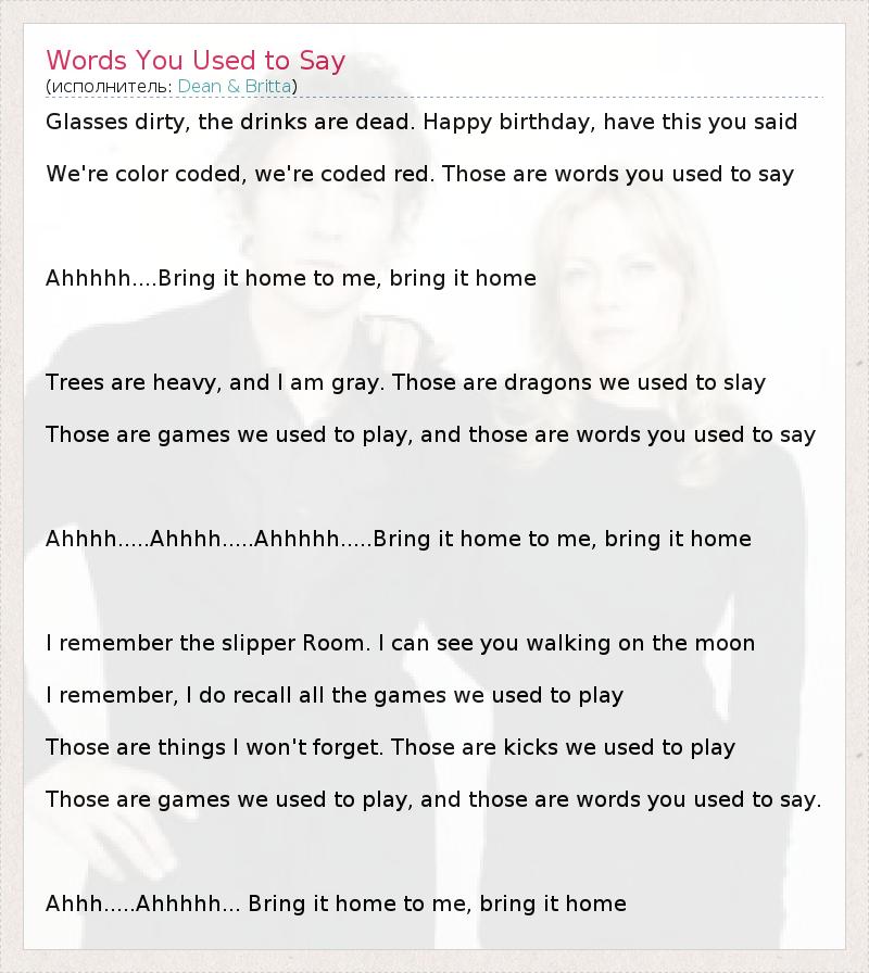 Glasses dirty, the drinks are dead. Happy birthday, have this you said We're color coded, we're coded red. Those are words you used to say Ahhhhh....Bring it home to me, bring it home Trees are heavy, and I am gray. Those are dragons we used to slay Those are games we used to play, and those are words you used to say Ahhhh.....Ahhhh.....Ahhhhh.....Bring it home to me, bring it home I remember the slipper Room. I can see you walking on the moon I remember, I do recall all the games we used to play Those are things I won't forget. Those are kicks we used to play Those are games we used to play, and those are words you used to say. Ahhh.....Ahhhhh... Bring it home to me, bring it home