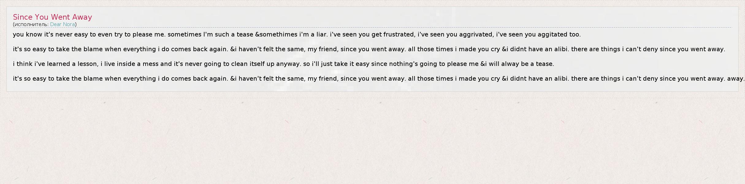 it's so easy to take the blame when everything i do comes back again. &i haven't felt the same, my friend, since you went away. all those times i made you cry &i didnt have an alibi. there are things i can't deny since you went away. away.