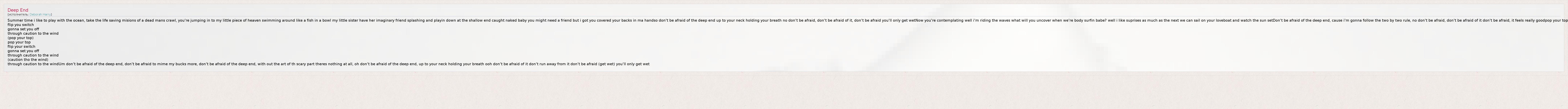 Summer time i like to play with the ocean, take the life saving misions of a dead mans crawl, you're jumping in to my little piece of heaven swimming around like a fish in a bowl my little sister have her imaginary friend splashing and playin down at the shallow end caught naked baby you might need a friend but i got you covered your backs in ma handso don't be afraid of the deep end up to your neck holding your breath no don't be afraid, don't be afraid of it, don't be afraid you'll only get wetNow you're contemplating well i'm riding the waves what will you uncover when we're body surfin babe? well i like suprises as much as the next we can sail on your loveboat and watch the sun setDon't be afraid of the deep end, cause i'm gonna follow the two by two rule, no don't be afraid, don't be afraid of it don't be afraid, it feels really goodpop your top flip you switch gonna set you off through caution to the wind (pop your top) pop your top flip your switch gonna set you off through caution to the wind (caution tho the wind) through caution to the windUm don't be afraid of the deep end, don't be afraid to mime my bucks more, don't be afraid of the deep end, with out the art of th scary part theres nothing at all, oh don't be afraid of the deep end, up to your neck holding your breath ooh don't be afraid of it don't run away from it don't be afraid (get wet) you'll only get wet
