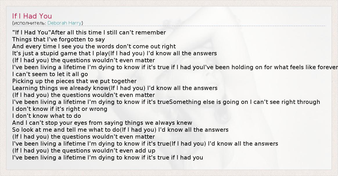 "If I Had You"After all this time I still can't remember Things that I've forgotten to say And every time I see you the words don't come out right It's just a stupid game that I play(If I had you) I'd know all the answers (If I had you) the questions wouldn't even matter I've been living a lifetime I'm dying to know if it's true if I had youI've been holding on for what feels like forever I can't seem to let it all go Picking up the pieces that we put together Learning things we already know(If I had you) I'd know all the answers (If I had you) the questions wouldn't even matter I've been living a lifetime I'm dying to know if it's trueSomething else is going on I can't see right through I don't know if it's right or wrong I don't know what to do And I can't stop your eyes from saying things we always knew So look at me and tell me what to do(If I had you) I'd know all the answers (If I had you) the questions wouldn't even matter I've been living a lifetime I'm dying to know if it's true(If I had you) I'd know all the answers (If I had you) the questions wouldn't even add up I've been living a lifetime I'm dying to know if it's true if I had you