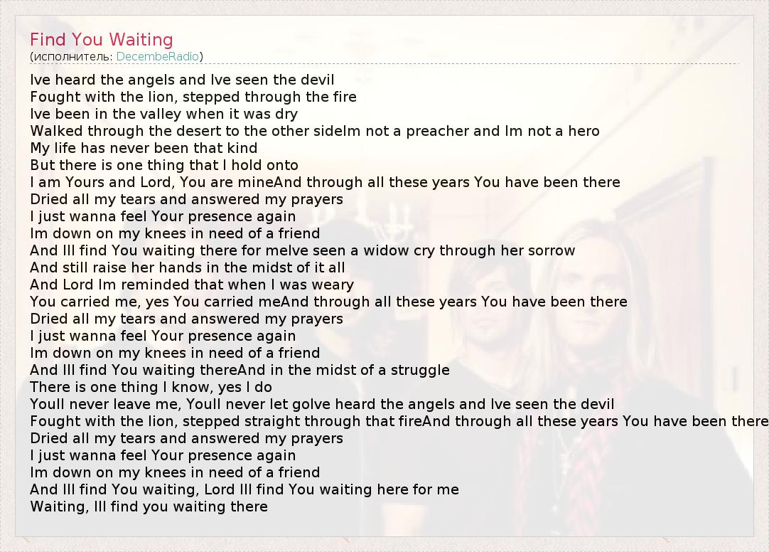 Ive heard the angels and Ive seen the devil Fought with the lion, stepped through the fire Ive been in the valley when it was dry Walked through the desert to the other sideIm not a preacher and Im not a hero My life has never been that kind But there is one thing that I hold onto I am Yours and Lord, You are mineAnd through all these years You have been there Dried all my tears and answered my prayers I just wanna feel Your presence again Im down on my knees in need of a friend And Ill find You waiting there for meIve seen a widow cry through her sorrow And still raise her hands in the midst of it all And Lord Im reminded that when I was weary You carried me, yes You carried meAnd through all these years You have been there Dried all my tears and answered my prayers I just wanna feel Your presence again Im down on my knees in need of a friend And Ill find You waiting thereAnd in the midst of a struggle There is one thing I know, yes I do Youll never leave me, Youll never let goIve heard the angels and Ive seen the devil Fought with the lion, stepped straight through that fireAnd through all these years You have been there Dried all my tears and answered my prayers I just wanna feel Your presence again Im down on my knees in need of a friend And Ill find You waiting, Lord Ill find You waiting here for me Waiting, Ill find you waiting there