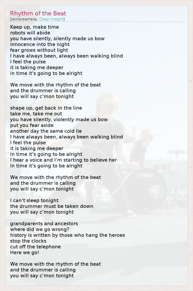 Keep up, make time robots will abide you have silently, silently made us bow innocence into the night fear grows without light I have always been, always been walking blind I feel the pulse it is taking me deeper in time it's going to be alright We move with the rhythm of the beat and the drummer is calling you will say c'mon tonight shape up, get back in the line take me, take me out you have silently, violently made us bow put you fear aside another day the same cold lie I have always been, always been walking blind I feel the pulse it is taking me deeper in time it's going to be alright I hear a voice and I'm starting to believe her In time it's going to be alright We move with the rhythm of the beat and the drummer is calling you will say c'mon tonight I can't sleep tonight the drummer must be taken down you will say c'mon tonight grandparents and ancestors where did we go wrong? history is written by those who hang the heroes stop the clocks cut off the telephone Here we go! We move with the rhythm of the beat and the drummer is calling you will say c'mon tonight