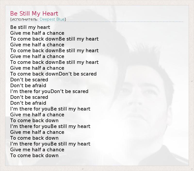 Be still my heart Give me half a chance To come back downBe still my heart Give me half a chance To come back downBe still my heart Give me half a chance To come back downBe still my heart Give me half a chance To come back downDon't be scared Don't be scared Don't be afraid I'm there for youDon't be scared Don't be scared Don't be afraid I'm there for youBe still my heart Give me half a chance To come back down I'm there for youBe still my heart Give me half a chance To come back down I'm there for youBe still my heart Give me half a chance To come back down