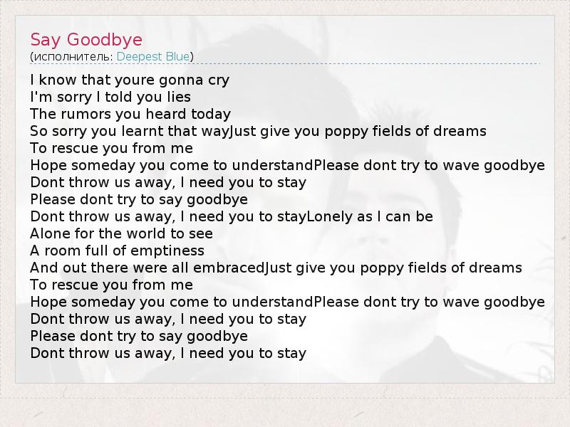 I know that youre gonna cry I'm sorry I told you lies The rumors you heard today So sorry you learnt that wayJust give you poppy fields of dreams To rescue you from me Hope someday you come to understandPlease dont try to wave goodbye Dont throw us away, I need you to stay Please dont try to say goodbye Dont throw us away, I need you to stayLonely as I can be Alone for the world to see A room full of emptiness And out there were all embracedJust give you poppy fields of dreams To rescue you from me Hope someday you come to understandPlease dont try to wave goodbye Dont throw us away, I need you to stay Please dont try to say goodbye Dont throw us away, I need you to stay