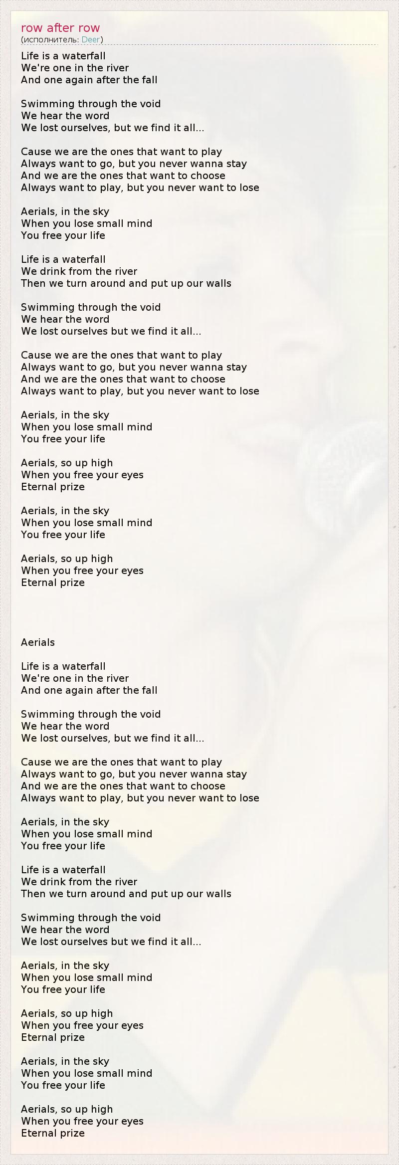 Life is a waterfall We're one in the river And one again after the fall Swimming through the void We hear the word We lost ourselves, but we find it all... Cause we are the ones that want to play Always want to go, but you never wanna stay And we are the ones that want to choose Always want to play, but you never want to lose Aerials, in the sky When you lose small mind You free your life Life is a waterfall We drink from the river Then we turn around and put up our walls Swimming through the void We hear the word We lost ourselves but we find it all... Cause we are the ones that want to play Always want to go, but you never wanna stay And we are the ones that want to choose Always want to play, but you never want to lose Aerials, in the sky When you lose small mind You free your life Aerials, so up high When you free your eyes Eternal prize Aerials, in the sky When you lose small mind You free your life Aerials, so up high When you free your eyes Eternal prize Aerials Life is a waterfall We're one in the river And one again after the fall Swimming through the void We hear the word We lost ourselves, but we find it all... Cause we are the ones that want to play Always want to go, but you never wanna stay And we are the ones that want to choose Always want to play, but you never want to lose Aerials, in the sky When you lose small mind You free your life Life is a waterfall We drink from the river Then we turn around and put up our walls Swimming through the void We hear the word We lost ourselves but we find it all... Aerials, in the sky When you lose small mind You free your life Aerials, so up high When you free your eyes Eternal prize Aerials, in the sky When you lose small mind You free your life Aerials, so up high When you free your eyes Eternal prize
