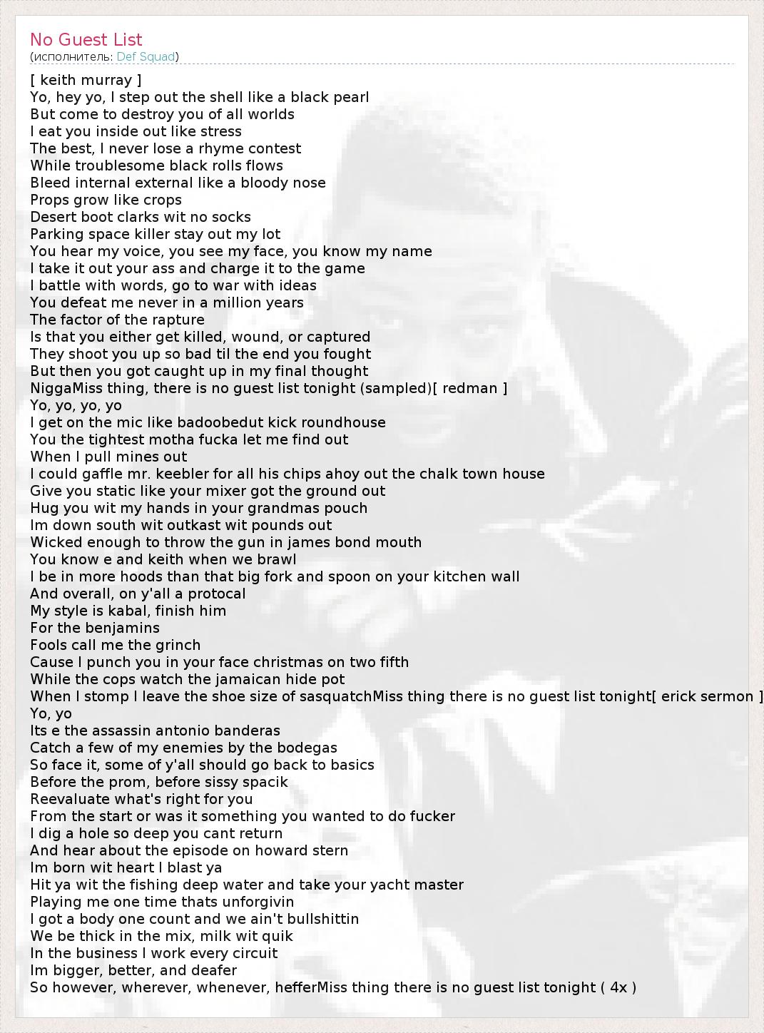 NiggaMiss thing, there is no guest list tonight (sampled)[ redman ]