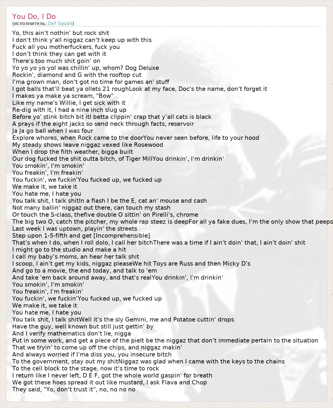 Yo, this ain't nothin' but rock shit I don't think y'all niggaz can't keep up with this Fuck all you motherfuckers, fuck you I don't think they can get with it There's too much shit goin' on Yo yo yo yo yoI was chillin' up, whom? Dog Deluxe Rockin', diamond and G with the rooftop cut I'ma grown man, don't got no time for games an' stuff I got balls that'll beat ya ollets 21 roughLook at my face, Doc's the name, don't forget it I makes ya make ya scream, "Bow" Like my name's Willie, I get sick with it Re-dig with it, I had a nine inch slug up Before yo' stink bitch bit itI betta clippin' crap that y'all cats is black A prays if the eight jacks so send neck through facts, reservoir Ja Ja go ball when I was four Explore whores, when Rock came to the doorYou never seen before, life to your hood My steady shows leave niggaz vexed like Rosewood When I drop the filth weather, bigga built Our dog fucked the shit outta bitch, of Tiger MillYou drinkin', I'm drinkin' You smokin', I'm smokin' You freakin', I'm freakin' You fuckin', we fuckin'You fucked up, we fucked up We make it, we take it You hate me, I hate you You talk shit, I talk shitIn a flash I be the E, cat an' mouse and cash Not many ballin' niggaz out there, can touch my stash Or touch the S-class, thefive double O sittin' on Pirelli's, chrome The big two O, catch the pitcher, my whole rap steez is deepFor all ya fake dues, I'm the only show that peeps Last week I was uptown, playin' the streets Step upon 1-5-fifth and get [Incomprehensible] That's when I do, when I roll dolo, I call her bitchThere was a time if I ain't doin' that, I ain't doin' shit I might go to the studio and make a hit I call my baby's moms, an hear her talk shit I scoop, I ain't get my kids, niggaz pleaseWe hit Toys are Russ and then Micky D's And go to a movie, the end today, and talk to 'em And take 'em back around away, and that's realYou drinkin', I'm drinkin' You smokin', I'm smokin' You freakin', I'm freakin' You fuckin', we fuckin'You fucked up, we fucked up We make it, we take it You hate me, I hate you You talk shit, I talk shitWell it's the sly Gemini, me and Potatoe cuttin' drops Have the guy, well known but still just gettin' by And I verify mathematics don't lie, nigga Put in some work, and get a piece of the pieIt be the niggaz that don't immediate pertain to the situation That we tryin' to come up off the chips, and niggaz makin' And always worried if I'ma diss you, you insecure bitch To the government, stay out my shitNiggaz was glad when I came with the keys to the chains To the cell block to the stage, now it's time to rock I return like I never left, D E F, got the whole world gaspin' for breath We got these hoes spread it out like mustard, I ask Flava and Chop They said, "Yo, don't trust it", no, no no no