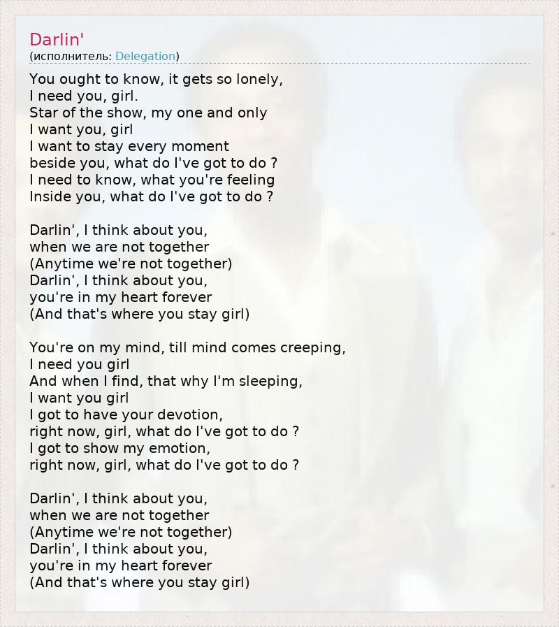 You ought to know, it gets so lonely, I need you, girl. Star of the show, my one and only I want you, girl I want to stay every moment beside you, what do I've got to do ? I need to know, what you're feeling Inside you, what do I've got to do ? Darlin', I think about you, when we are not together (Anytime we're not together) Darlin', I think about you, you're in my heart forever (And that's where you stay girl) You're on my mind, till mind comes creeping, I need you girl And when I find, that why I'm sleeping, I want you girl I got to have your devotion, right now, girl, what do I've got to do ? I got to show my emotion, right now, girl, what do I've got to do ? Darlin', I think about you, when we are not together (Anytime we're not together) Darlin', I think about you, you're in my heart forever (And that's where you stay girl)