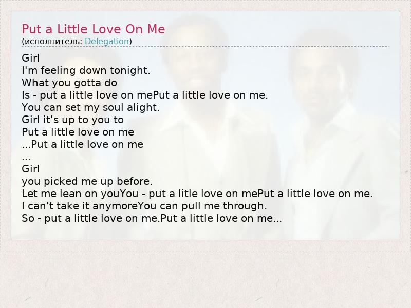 Girl I'm feeling down tonight. What you gotta do Is - put a little love on mePut a little love on me. You can set my soul alight. Girl it's up to you to Put a little love on me ...Put a little love on me ... Girl you picked me up before. Let me lean on youYou - put a litle love on mePut a little love on me. I can't take it anymoreYou can pull me through. So - put a little love on me.Put a little love on me...