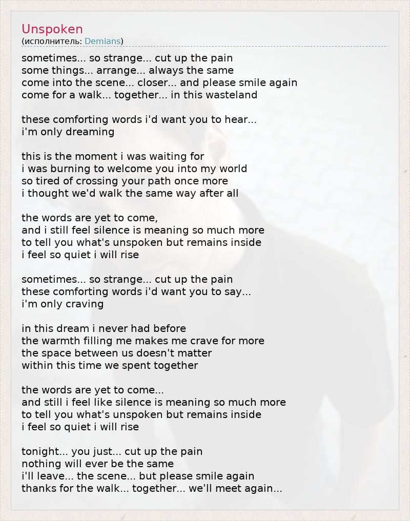 sometimes... so strange... cut up the pain some things... arrange... always the same come into the scene... closer... and please smile again come for a walk... together... in this wasteland these comforting words i'd want you to hear... i'm only dreaming this is the moment i was waiting for i was burning to welcome you into my world so tired of crossing your path once more i thought we'd walk the same way after all the words are yet to come, and i still feel silence is meaning so much more to tell you what's unspoken but remains inside i feel so quiet i will rise sometimes... so strange... cut up the pain these comforting words i'd want you to say... i'm only craving in this dream i never had before the warmth filling me makes me crave for more the space between us doesn't matter within this time we spent together the words are yet to come... and still i feel like silence is meaning so much more to tell you what's unspoken but remains inside i feel so quiet i will rise tonight... you just... cut up the pain nothing will ever be the same i'll leave... the scene... but please smile again thanks for the walk... together... we'll meet again...