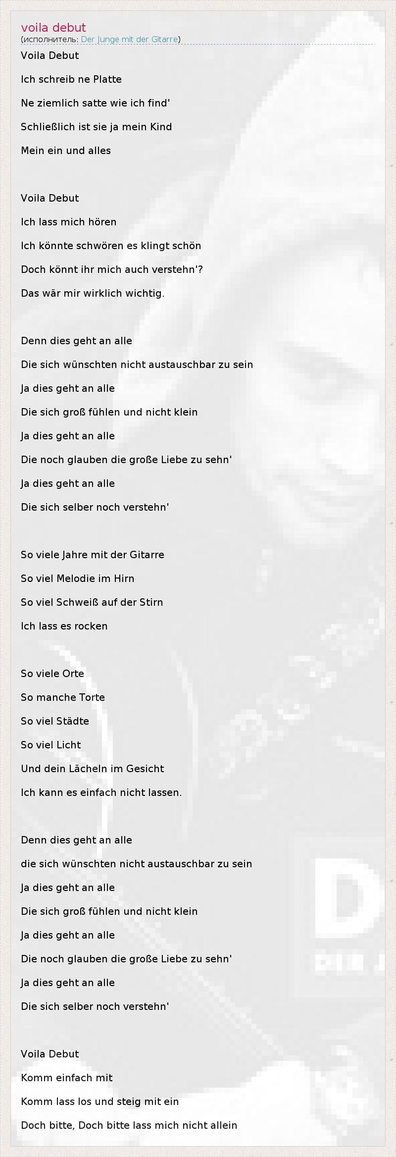 Voila Debut Ich schreib ne Platte Ne ziemlich satte wie ich find' Schließlich ist sie ja mein Kind Mein ein und alles Voila Debut Ich lass mich hören Ich könnte schwören es klingt schön Doch könnt ihr mich auch verstehn'? Das wär mir wirklich wichtig. Denn dies geht an alle Die sich wünschten nicht austauschbar zu sein Ja dies geht an alle Die sich groß fühlen und nicht klein Ja dies geht an alle Die noch glauben die große Liebe zu sehn' Ja dies geht an alle Die sich selber noch verstehn' So viele Jahre mit der Gitarre So viel Melodie im Hirn So viel Schweiß auf der Stirn Ich lass es rocken So viele Orte So manche Torte So viel Städte So viel Licht Und dein Lächeln im Gesicht Ich kann es einfach nicht lassen. Denn dies geht an alle die sich wünschten nicht austauschbar zu sein Ja dies geht an alle Die sich groß fühlen und nicht klein Ja dies geht an alle Die noch glauben die große Liebe zu sehn' Ja dies geht an alle Die sich selber noch verstehn' Voila Debut Komm einfach mit Komm lass los und steig mit ein Doch bitte, Doch bitte lass mich nicht allein