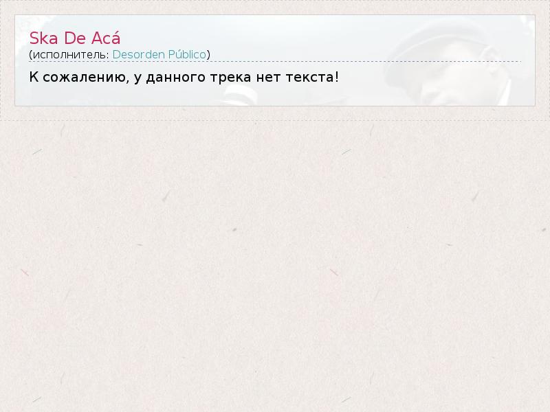 Это интересно:Desorden Público - ска/рок-группа, основанная в 1985 в Каракасе, Венесуэле.Музыка группы - это смесь ска, латиноамериканского рок, регги и народных латиноамериканских мелодий. Социальная лирика группы известна тем, что она комментирует политические события в Венесуэле и в Латинской Америке. Desorden Público использует в своем творчестве различные языки и способствует расовой и социальной терпимости.... продолжение