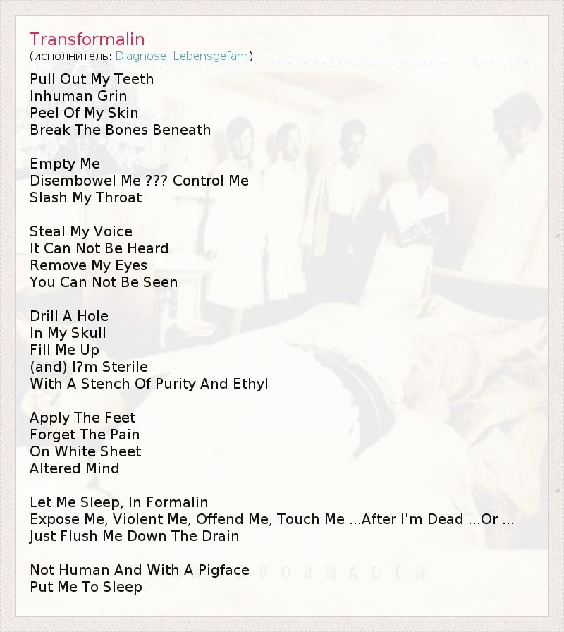 Вырвите мои зубы Нечеловеческий оскал Сдерите с меня кожу Переломайте кости Опустошите меня Потрошите меня, контролируйте меня Перережьте мне горло Отнимите у меня голос Чтобы меня не услышали Вырвите мои глаза Чтобы вас не увидели Свяжите ноги Забудь боль На белой простыне Измененное сознание Позвольте мне уснуть, в формалине Разденьте меня, оскверняйте меня, оскорбляйте меня, касайтесь меня …после моей смерти… или… Просто спустите меня в трубу Не человек, со свиным рылом Уложите меня спать