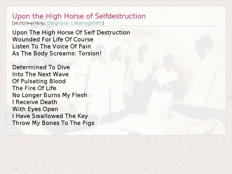 А как ты думаешь, о чем песня "Upon the High Horse of Selfdestruction" ?