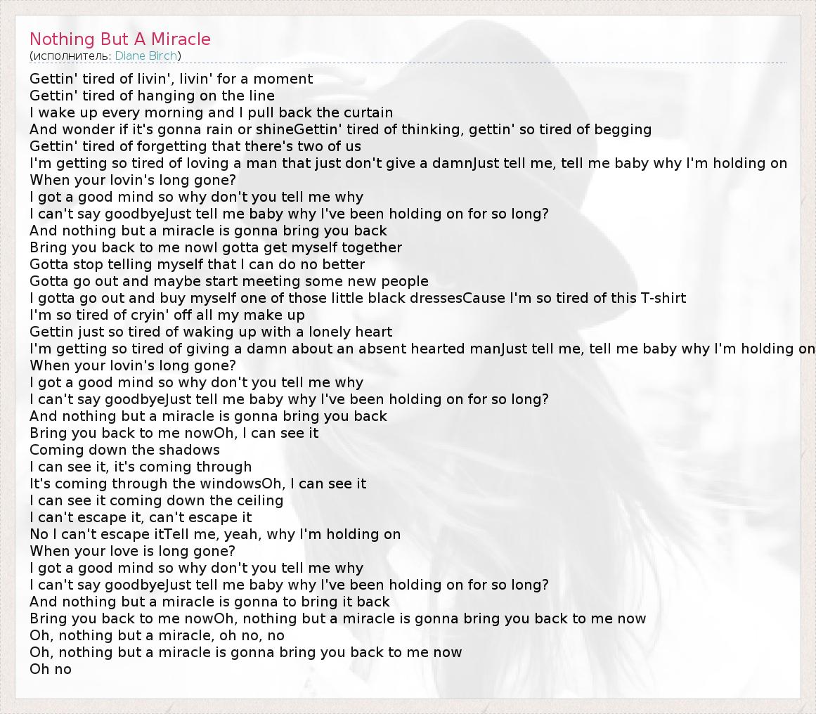 Bring you back to me nowOh, nothing but a miracle is gonna bring you back to me now