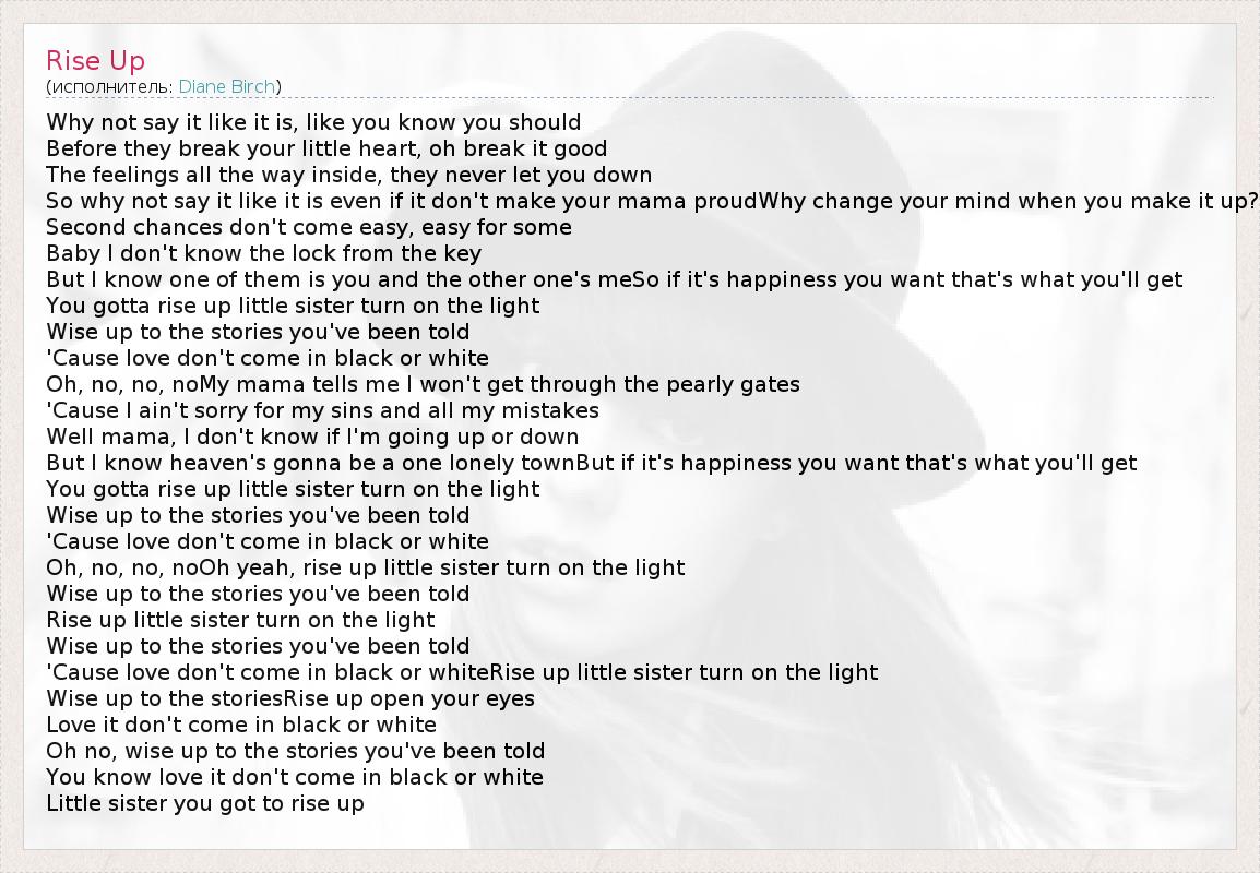 Why not say it like it is, like you know you should Before they break your little heart, oh break it good The feelings all the way inside, they never let you down So why not say it like it is even if it don't make your mama proudWhy change your mind when you make it up? Second chances don't come easy, easy for some Baby I don't know the lock from the key But I know one of them is you and the other one's meSo if it's happiness you want that's what you'll get You gotta rise up little sister turn on the light Wise up to the stories you've been told 'Cause love don't come in black or white Oh, no, no, noMy mama tells me I won't get through the pearly gates 'Cause I ain't sorry for my sins and all my mistakes Well mama, I don't know if I'm going up or down But I know heaven's gonna be a one lonely townBut if it's happiness you want that's what you'll get You gotta rise up little sister turn on the light Wise up to the stories you've been told 'Cause love don't come in black or white Oh, no, no, noOh yeah, rise up little sister turn on the light Wise up to the stories you've been told Rise up little sister turn on the light Wise up to the stories you've been told 'Cause love don't come in black or whiteRise up little sister turn on the light Wise up to the storiesRise up open your eyes Love it don't come in black or white Oh no, wise up to the stories you've been told You know love it don't come in black or white Little sister you got to rise up