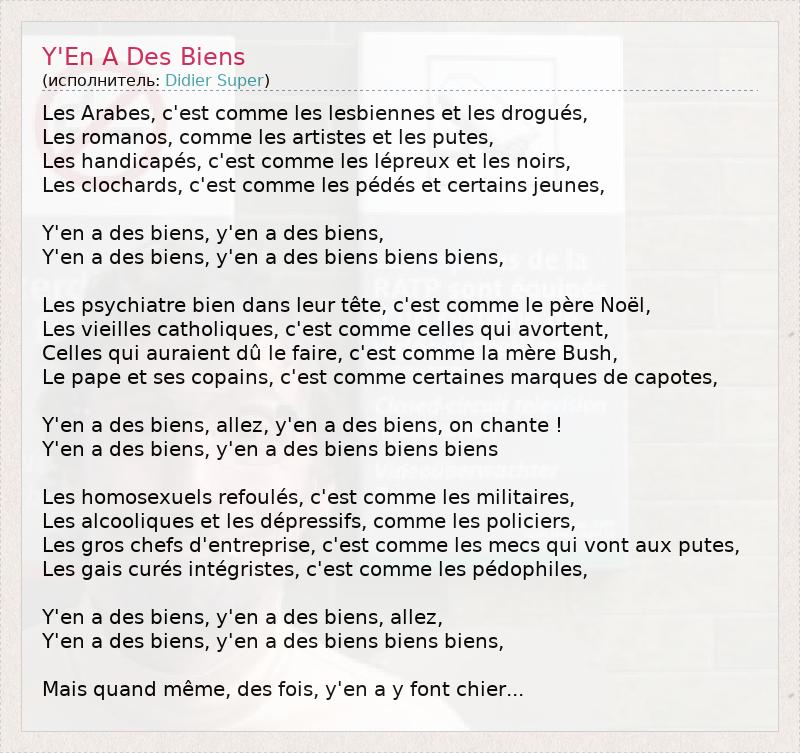 Les Arabes, c'est Comme ле Lesbiennes и живопись Drogues, Les Роман, Comme ле артисты и др ле putes, Les помех, c'est Comme ле lépreux и др ле Нуар, Les clochards, C'est Comme ле pédés ET certains Jeunes, Y'en де Biens, y'en де Biens, Y'en де Biens, y'en де Biens Biens Biens, Les psychiatre Bien Dans Leur тет, c'est Comme ле Пер Ноэль, Les Vieilles Catholiques, c'est Comme Celles Квай avortent, Сель Квай auraient Du Le Faire, c'est Comme ла mère Буш, Le Папе и др SES COPAINS, C'est Comme certaines Маркиза де капоты, Y'en де Biens, Allez, y'en де Biens, на Chanté! Y'en де Biens, y'en де Biens Biens Biens Les homosexuels refoulés, c'est Comme ле Militaires, Les alcooliques и живопись dépressifs, Comme ле policiers, Les Gros повара d'Entreprise, c'est Comme ле СОВС Квай vont Окс putes, Les Gáis лечит intégristes, c'est Comme ле педофилов, Y'en де Biens, y'en де Biens, Allez, Y'en де Biens, y'en де Biens Biens Biens, Mais Quand мем, де Фуа, y'en ай chier шрифта ...