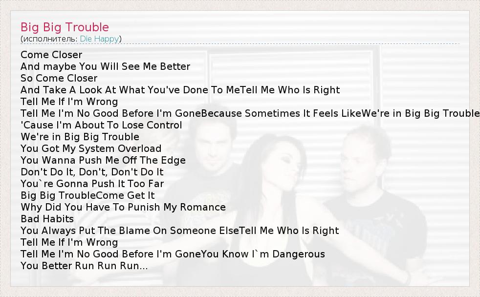 Come Closer And maybe You Will See Me Better So Come Closer And Take A Look At What You've Done To MeTell Me Who Is Right Tell Me If I'm Wrong Tell Me I'm No Good Before I'm GoneBecause Sometimes It Feels LikeWe're in Big Big Trouble 'Cause I'm About To Lose Control We're in Big Big Trouble You Got My System Overload You Wanna Push Me Off The Edge Don't Do It, Don't, Don't Do It You`re Gonna Push It Too Far Big Big TroubleCome Get It Why Did You Have To Punish My Romance Bad Habits You Always Put The Blame On Someone ElseTell Me Who Is Right Tell Me If I'm Wrong Tell Me I'm No Good Before I'm GoneYou Know I`m Dangerous You Better Run Run Run...