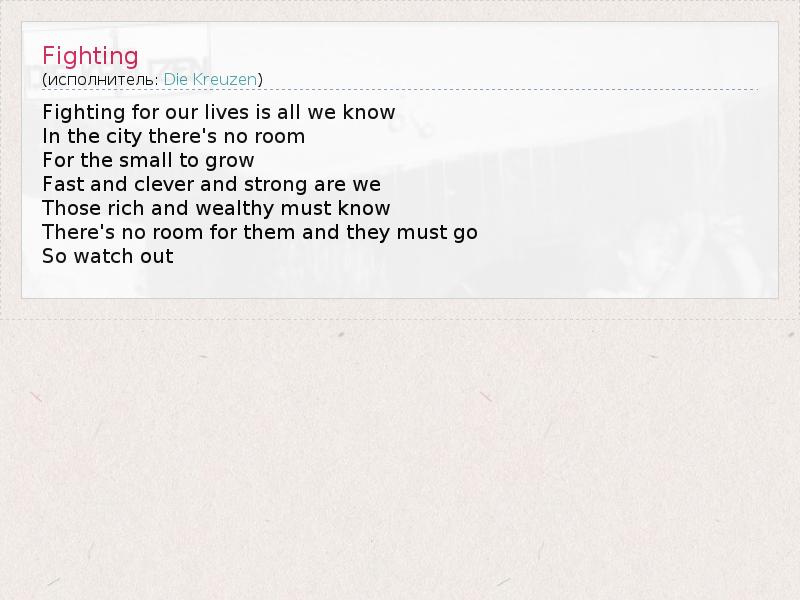 Fighting for our lives is all we know In the city there's no room For the small to grow Fast and clever and strong are we Those rich and wealthy must know There's no room for them and they must go So watch out
