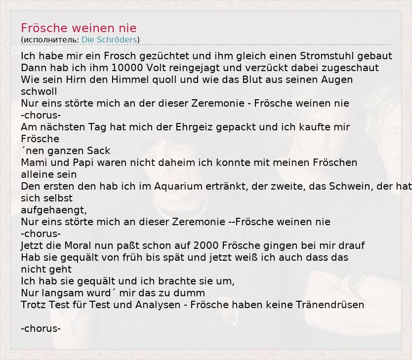 Ich habe mir ein Frosch gezüchtet und ihm gleich einen Stromstuhl gebaut Dann hab ich ihm 10000 Volt reingejagt und verzückt dabei zugeschaut Wie sein Hirn den Himmel quoll und wie das Blut aus seinen Augen schwoll Nur eins störte mich an der dieser Zeremonie - Frösche weinen nie -chorus- Am nächsten Tag hat mich der Ehrgeiz gepackt und ich kaufte mir Frösche ´nen ganzen Sack Mami und Papi waren nicht daheim ich konnte mit meinen Fröschen alleine sein Den ersten den hab ich im Aquarium ertränkt, der zweite, das Schwein, der hat sich selbst aufgehaengt, Nur eins störte mich an dieser Zeremonie --Frösche weinen nie -chorus- Jetzt die Moral nun paßt schon auf 2000 Frösche gingen bei mir drauf Hab sie gequält von früh bis spät und jetzt weiß ich auch dass das nicht geht Ich hab sie gequält und ich brachte sie um, Nur langsam wurd´ mir das zu dumm Trotz Test für Test und Analysen - Frösche haben keine Tränendrüsen -chorus-