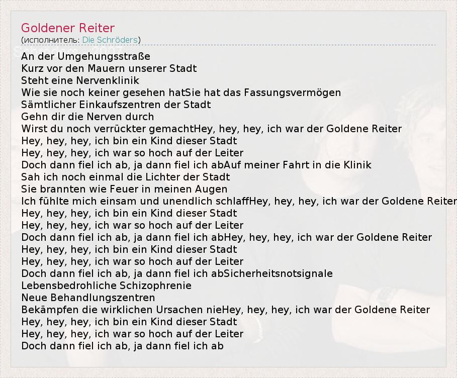 An der Umgehungsstraße Kurz vor den Mauern unserer Stadt Steht eine Nervenklinik Wie sie noch keiner gesehen hatSie hat das Fassungsvermögen Sämtlicher Einkaufszentren der Stadt Gehn dir die Nerven durch Wirst du noch verrückter gemachtHey, hey, hey, ich war der Goldene Reiter Hey, hey, hey, ich bin ein Kind dieser Stadt Hey, hey, hey, ich war so hoch auf der Leiter Doch dann fiel ich ab, ja dann fiel ich abAuf meiner Fahrt in die Klinik Sah ich noch einmal die Lichter der Stadt Sie brannten wie Feuer in meinen Augen Ich fühlte mich einsam und unendlich schlaffHey, hey, hey, ich war der Goldene Reiter Hey, hey, hey, ich bin ein Kind dieser Stadt Hey, hey, hey, ich war so hoch auf der Leiter Doch dann fiel ich ab, ja dann fiel ich abHey, hey, hey, ich war der Goldene Reiter Hey, hey, hey, ich bin ein Kind dieser Stadt Hey, hey, hey, ich war so hoch auf der Leiter Doch dann fiel ich ab, ja dann fiel ich abSicherheitsnotsignale Lebensbedrohliche Schizophrenie Neue Behandlungszentren Bekämpfen die wirklichen Ursachen nieHey, hey, hey, ich war der Goldene Reiter Hey, hey, hey, ich bin ein Kind dieser Stadt Hey, hey, hey, ich war so hoch auf der Leiter Doch dann fiel ich ab, ja dann fiel ich ab