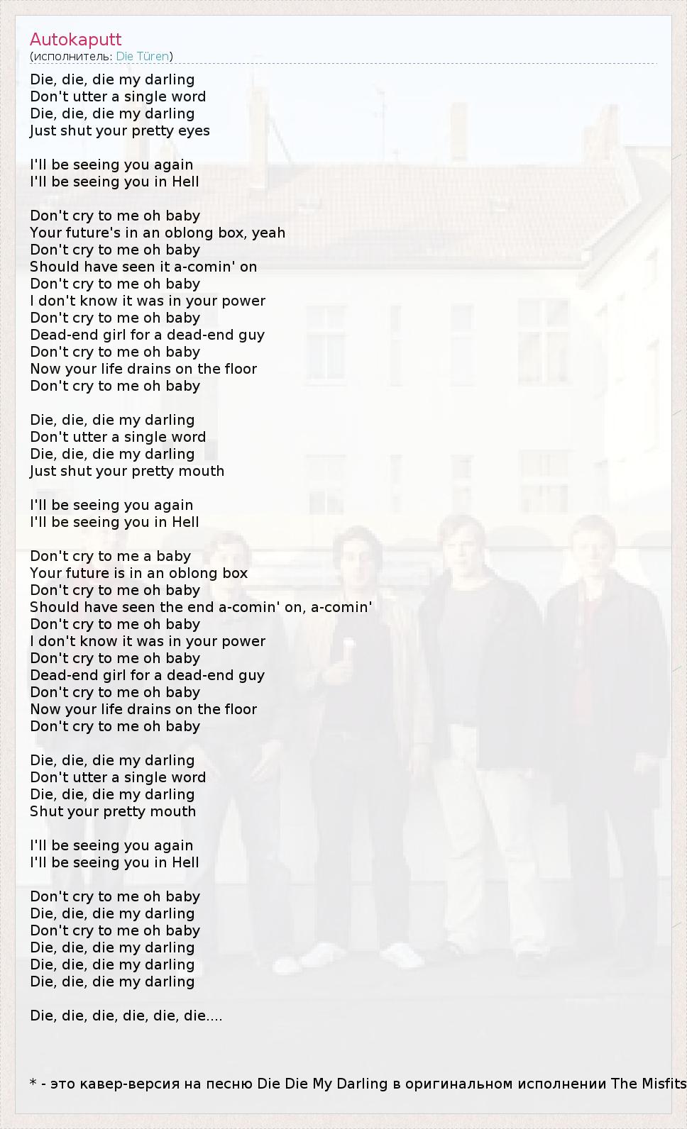 Die, die, die my darling Don't utter a single word Die, die, die my darling Just shut your pretty eyes I'll be seeing you again I'll be seeing you in Hell Don't cry to me oh baby Your future's in an oblong box, yeah Don't cry to me oh baby Should have seen it a-comin' on Don't cry to me oh baby I don't know it was in your power Don't cry to me oh baby Dead-end girl for a dead-end guy Don't cry to me oh baby Now your life drains on the floor Don't cry to me oh baby Die, die, die my darling Don't utter a single word Die, die, die my darling Just shut your pretty mouth I'll be seeing you again I'll be seeing you in Hell Don't cry to me a baby Your future is in an oblong box Don't cry to me oh baby Should have seen the end a-comin' on, a-comin' Don't cry to me oh baby I don't know it was in your power Don't cry to me oh baby Dead-end girl for a dead-end guy Don't cry to me oh baby Now your life drains on the floor Don't cry to me oh baby Die, die, die my darling Don't utter a single word Die, die, die my darling Shut your pretty mouth I'll be seeing you again I'll be seeing you in Hell Don't cry to me oh baby Die, die, die my darling Don't cry to me oh baby Die, die, die my darling Die, die, die my darling Die, die, die my darling Die, die, die, die, die, die.... * - это кавер-версия на песню Die Die My Darling в оригинальном исполнении The Misfits