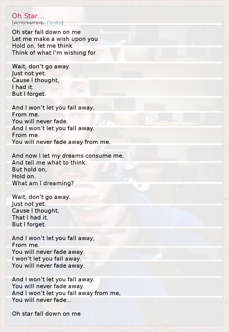 Oh star fall down on me Let me make a wish upon you Hold on, let me think Think of what I'm wishing for Wait, don't go away. Just not yet. Cause I thought, I had it. But I forget. And I won't let you fall away, From me. You will never fade. And I won't let you fall away. From me. You will never fade away from me. And now I let my dreams consume me, And tell me what to think. But hold on, Hold on. What am I dreaming? Wait, don't go away. Just not yet. Cause I thought, That I had it. But I forget. And I won't let you fall away, From me. You will never fade away. I won't let you fall away. You will never fade away. And I won't let you fall away. You will never fade away. And I won't let you fall away from me, You will never fade... Oh star fall down on me