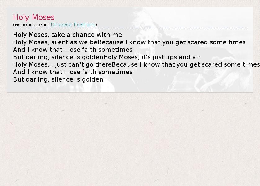 Holy Moses, take a chance with me Holy Moses, silent as we beBecause I know that you get scared some times And I know that I lose faith sometimes But darling, silence is goldenHoly Moses, it's just lips and air Holy Moses, I just can't go thereBecause I know that you get scared some times And I know that I lose faith sometimes But darling, silence is golden