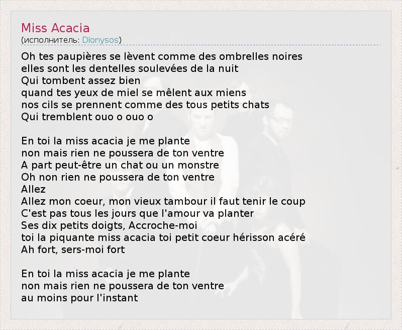 Oh tes paupières se lèvent comme des ombrelles noires elles sont les dentelles soulevées de la nuit Qui tombent assez bien quand tes yeux de miel se mêlent aux miens nos cils se prennent comme des tous petits chats Qui tremblent ouo o ouo o En toi la miss acacia je me plante non mais rien ne poussera de ton ventre A part peut-être un chat ou un monstre Oh non rien ne poussera de ton ventre Allez Allez mon coeur, mon vieux tambour il faut tenir le coup C'est pas tous les jours que l'amour va planter Ses dix petits doigts, Accroche-moi toi la piquante miss acacia toi petit coeur hérisson acéré Ah fort, sers-moi fort En toi la miss acacia je me plante non mais rien ne poussera de ton ventre au moins pour l'instant