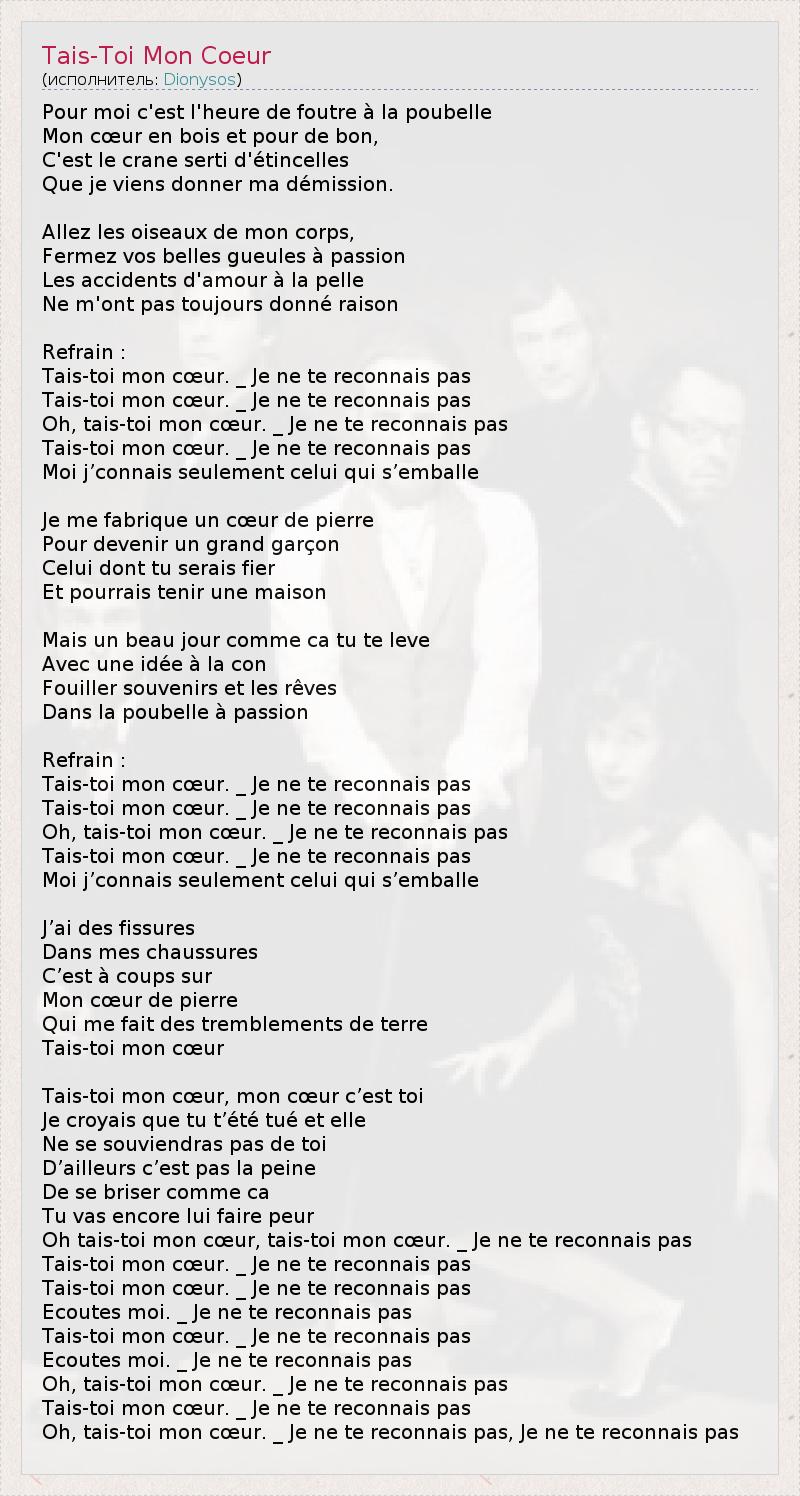 Pour moi c'est l'heure de foutre à la poubelle Mon cœur en bois et pour de bon, C'est le crane serti d'étincelles Que je viens donner ma démission. Allez les oiseaux de mon corps, Fermez vos belles gueules à passion Les accidents d'amour à la pelle Ne m'ont pas toujours donné raison Refrain : Tais-toi mon cœur. _ Je ne te reconnais pas Tais-toi mon cœur. _ Je ne te reconnais pas Oh, tais-toi mon cœur. _ Je ne te reconnais pas Tais-toi mon cœur. _ Je ne te reconnais pas Moi j’connais seulement celui qui s’emballe Je me fabrique un cœur de pierre Pour devenir un grand garçon Celui dont tu serais fier Et pourrais tenir une maison Mais un beau jour comme ca tu te leve Avec une idée à la con Fouiller souvenirs et les rêves Dans la poubelle à passion Refrain : Tais-toi mon cœur. _ Je ne te reconnais pas Tais-toi mon cœur. _ Je ne te reconnais pas Oh, tais-toi mon cœur. _ Je ne te reconnais pas Tais-toi mon cœur. _ Je ne te reconnais pas Moi j’connais seulement celui qui s’emballe J’ai des fissures Dans mes chaussures C’est à coups sur Mon cœur de pierre Qui me fait des tremblements de terre Tais-toi mon cœur Tais-toi mon cœur, mon cœur c’est toi Je croyais que tu t’été tué et elle Ne se souviendras pas de toi D’ailleurs c’est pas la peine De se briser comme ca Tu vas encore lui faire peur Oh tais-toi mon cœur, tais-toi mon cœur. _ Je ne te reconnais pas Tais-toi mon cœur. _ Je ne te reconnais pas Tais-toi mon cœur. _ Je ne te reconnais pas Ecoutes moi. _ Je ne te reconnais pas Tais-toi mon cœur. _ Je ne te reconnais pas Ecoutes moi. _ Je ne te reconnais pas Oh, tais-toi mon cœur. _ Je ne te reconnais pas Tais-toi mon cœur. _ Je ne te reconnais pas Oh, tais-toi mon cœur. _ Je ne te reconnais pas, Je ne te reconnais pas