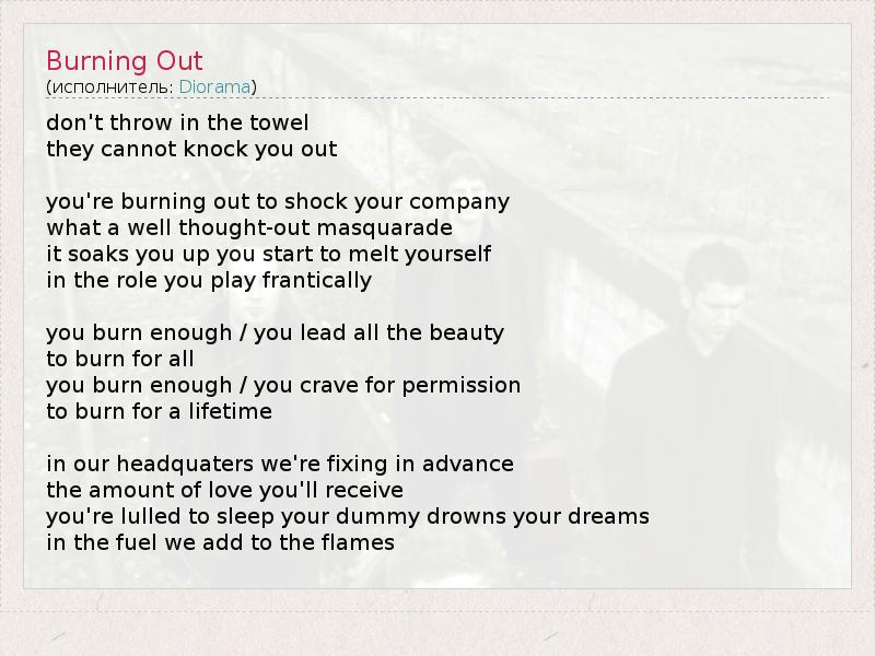 don't throw in the towel they cannot knock you out you're burning out to shock your company what a well thought-out masquarade it soaks you up you start to melt yourself in the role you play frantically you burn enough / you lead all the beauty to burn for all you burn enough / you crave for permission to burn for a lifetime in our headquaters we're fixing in advance the amount of love you'll receive you're lulled to sleep your dummy drowns your dreams in the fuel we add to the flames